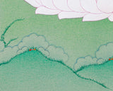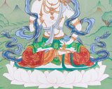 This hand-painted Thangka portrays Vajrasattva with a radiant white body, seated on a lotus throne atop a moon disc in the vajra position, representing steadfast stability and enlightenment. He holds a bell in his left hand, symbolizing wisdom, and a vajra in his right, representing compassion. The tender lotus seat and tranquil moon disc highlight his divine presence, making this thangka a sacred item for spiritual reflection, meditation, and purification rituals.