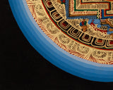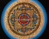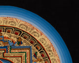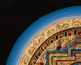 The double vajra, which consists of two crossed vajras forming an X-like configuration, denotes ultimate stability, equilibrium, and unwavering spiritual strength. Gold is used throughout the mandala not just for its visual elegance, but also for its spiritual meaning, which represents incorruptibility, an enlightened intellect, and heavenly illumination. Its presence heightens the piece's spiritual effectiveness, transforming it into a protective and empowering object for any sacred space, rather than simply a visual offering.
