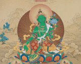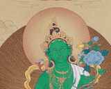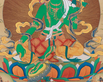 Explore this breathtaking hand-painted thangka of the Himalayan Buddhist Goddess Green Tara, the Compassionate Goddess, a true masterpiece of Tibetan artwork. Amitabha Buddha, Namgyalma, and Parnashavari accompany her. Created with natural Lhasa stone colors, cotton canvas, and 24K gold, this artwork embodies the traditional Karma Gadri style, blending Tibetan Buddhist heritage with high-quality materials. Gold detailing and vibrant stone pigments make a piece that radiates divine energy and timeless beauty.