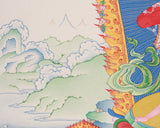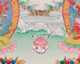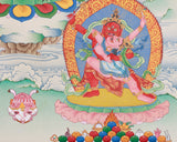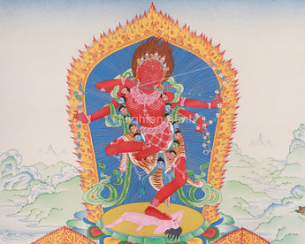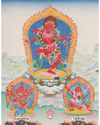 Meticulously created, the thangka of Kurukulla with Ganesha and Takiraja exemplifies traditional artistry. Hand-painted on premium cotton canvas with natural stone colors and accented with genuine 24K gold, this piece exemplifies timeless beauty and purity. The natural stone hues add depth and richness to the imagery, while the 24K gold highlights the divine essence of the deities, imparting a sacred glow. Made in the Karma Gadri style, using the ancient Tibetan technique, it combines artistic mastery with spiritual significance.