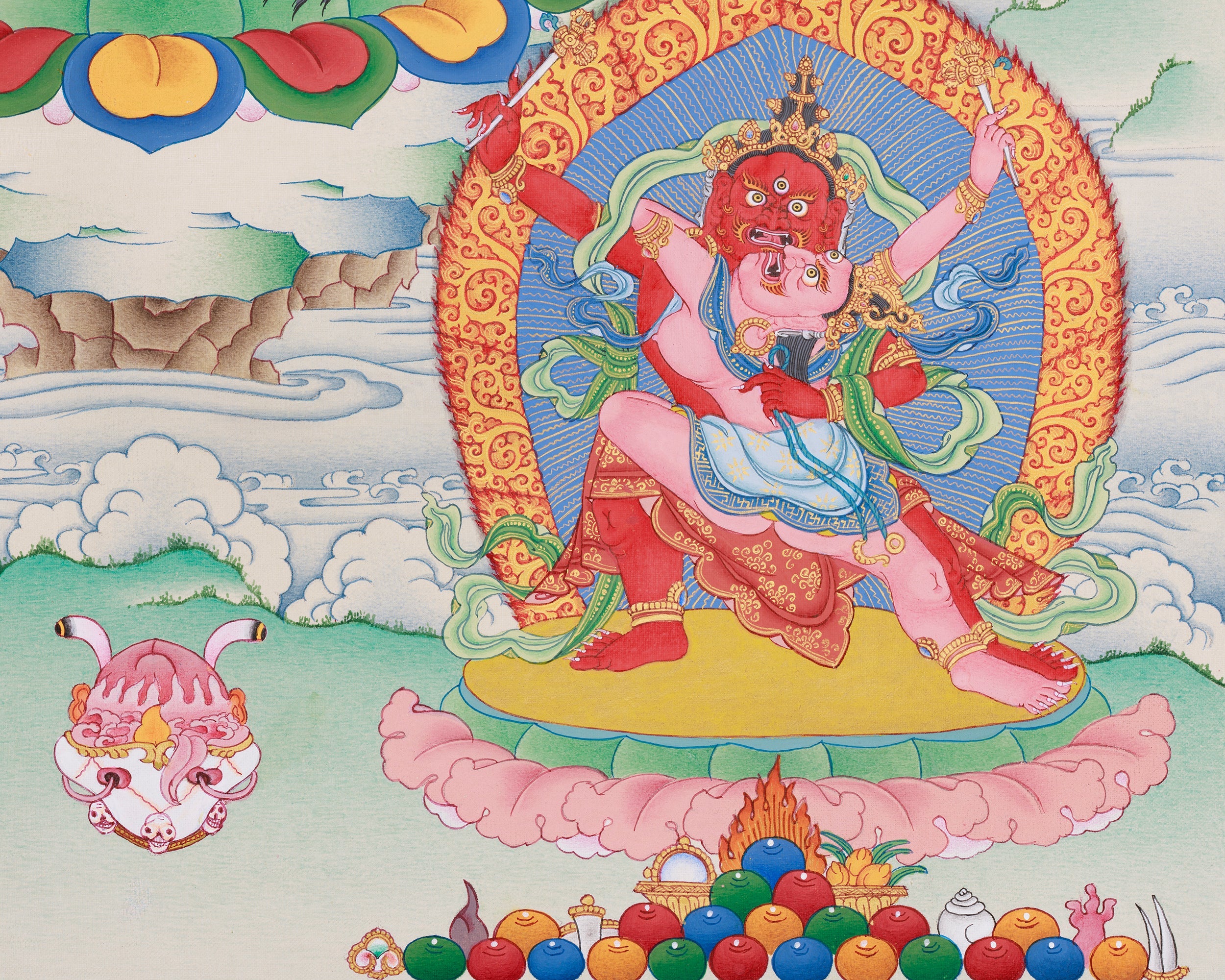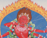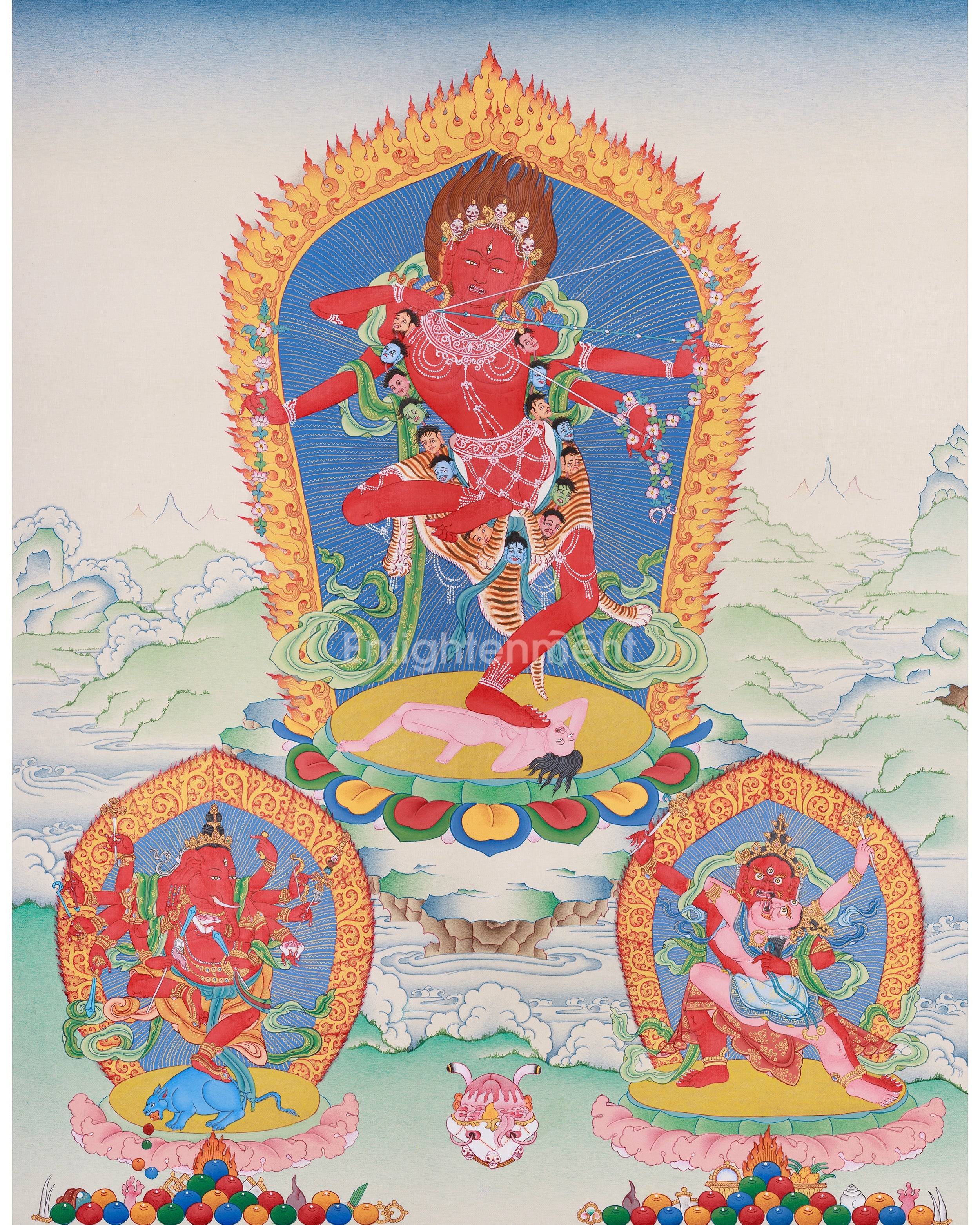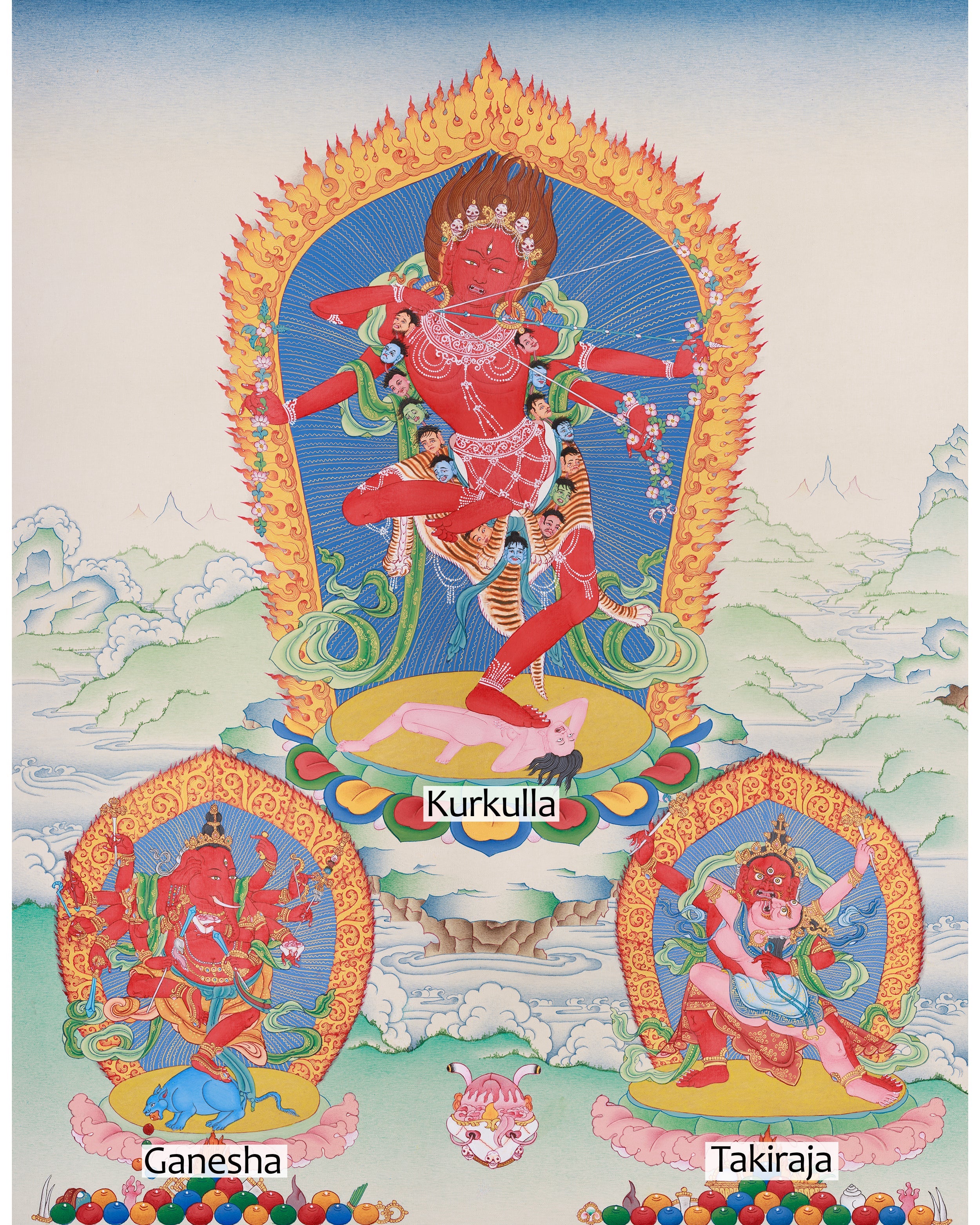 Kurukulla, a prominent dakini within Tibetan Buddhism, manifests her spiritual authority by transforming desire and attachment into enlightened wisdom. In this Thangka, she is portrayed with fiery red skin, emblematic of her vigorous energy. Her vigorous dance posture signifies her ability to dissolve illusions and attachments. The bow and arrow she wields symbolize her role in guiding practitioners toward enlightenment, blending the grace of a goddess with the strength of a warrior. Additionally, the thangka incorporates two esteemed deities: Ganesha and Takiraja. Ganesha, known as the remover of obstacles, represents wisdom and overcoming challenges, whereas Takiraja exemplifies the more formidable aspect of spiritual metamorphosis.