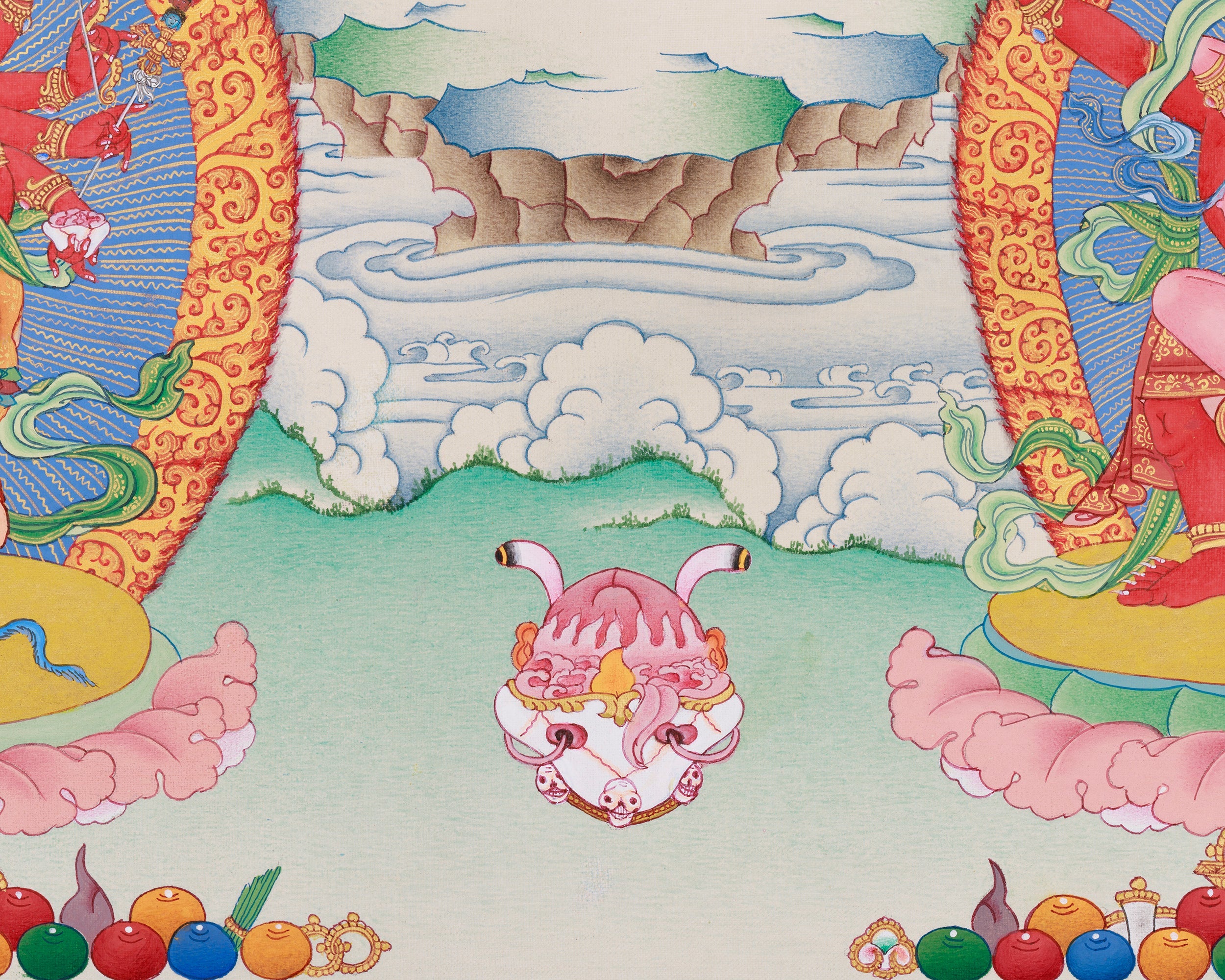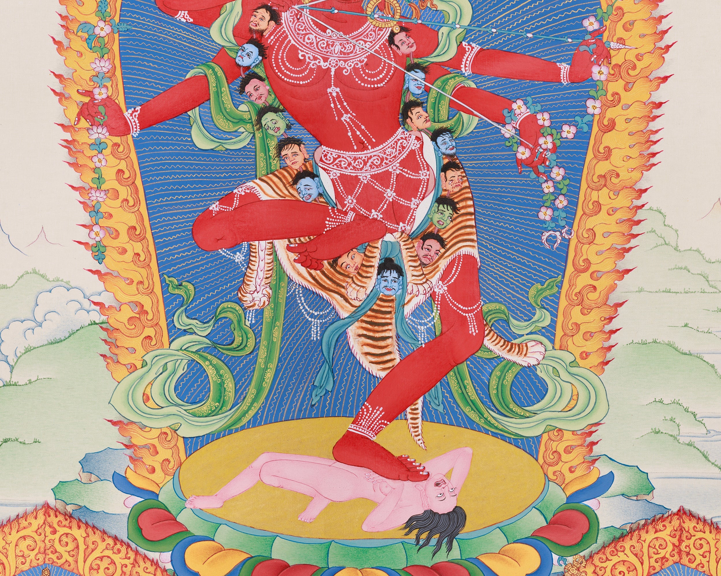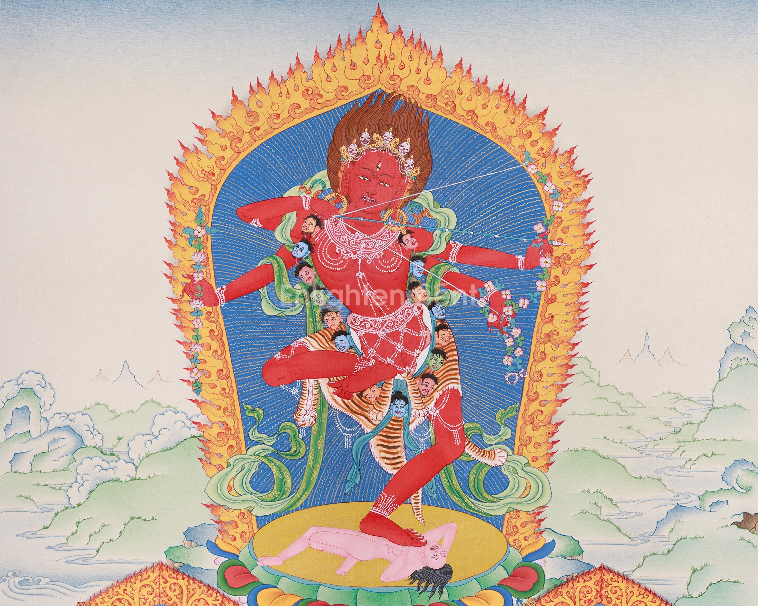 Kurukulla, a prominent dakini within Tibetan Buddhism, manifests her spiritual authority by transforming desire and attachment into enlightened wisdom. In this Thangka, she is portrayed with fiery red skin, emblematic of her vigorous energy. Her vigorous dance posture signifies her ability to dissolve illusions and attachments. The bow and arrow she wields symbolize her role in guiding practitioners toward enlightenment, blending the grace of a goddess with the strength of a warrior. Additionally, the thangka incorporates two esteemed deities: Ganesha and Takiraja. Ganesha, known as the remover of obstacles, represents wisdom and overcoming challenges, whereas Takiraja exemplifies the more formidable aspect of spiritual metamorphosis.