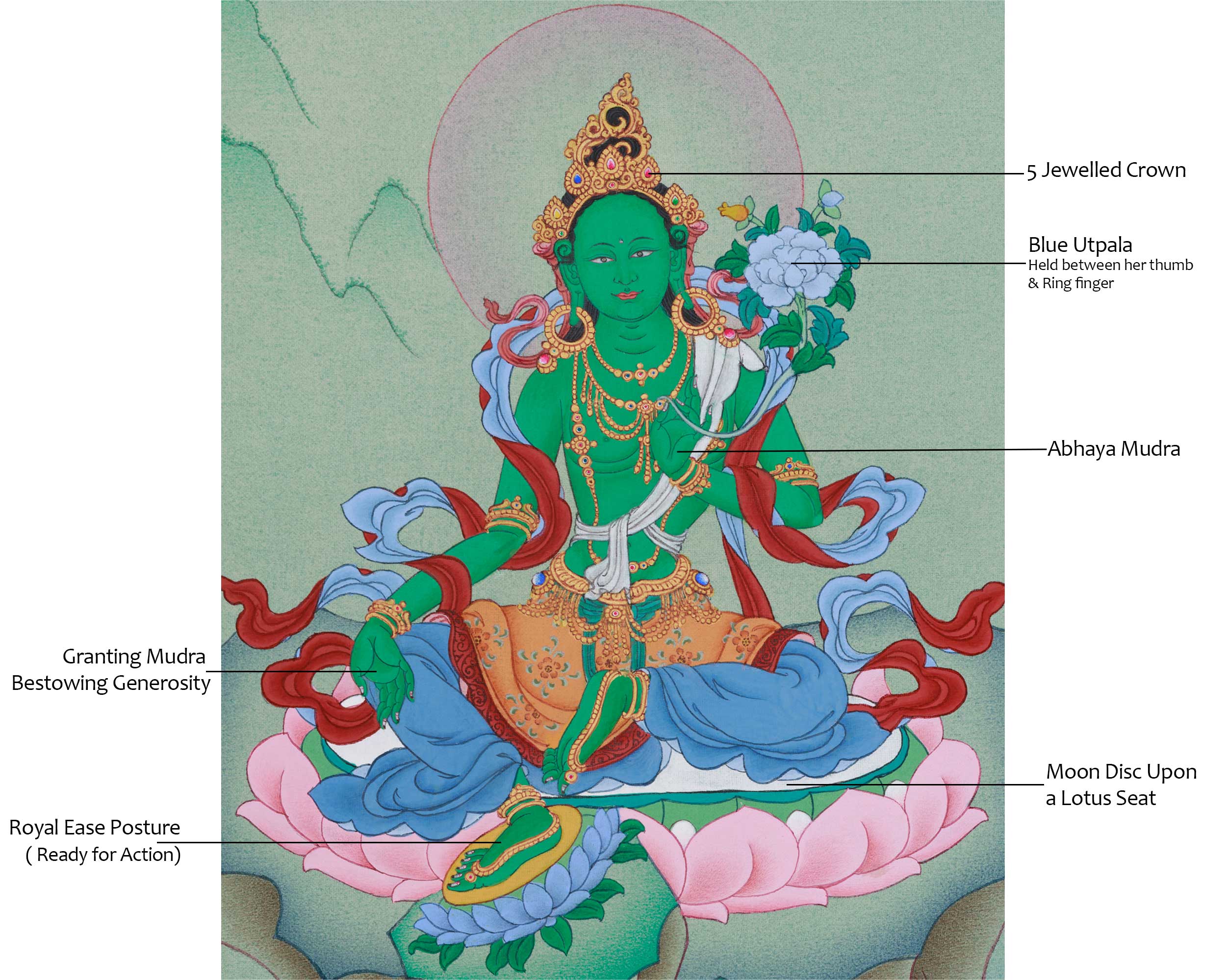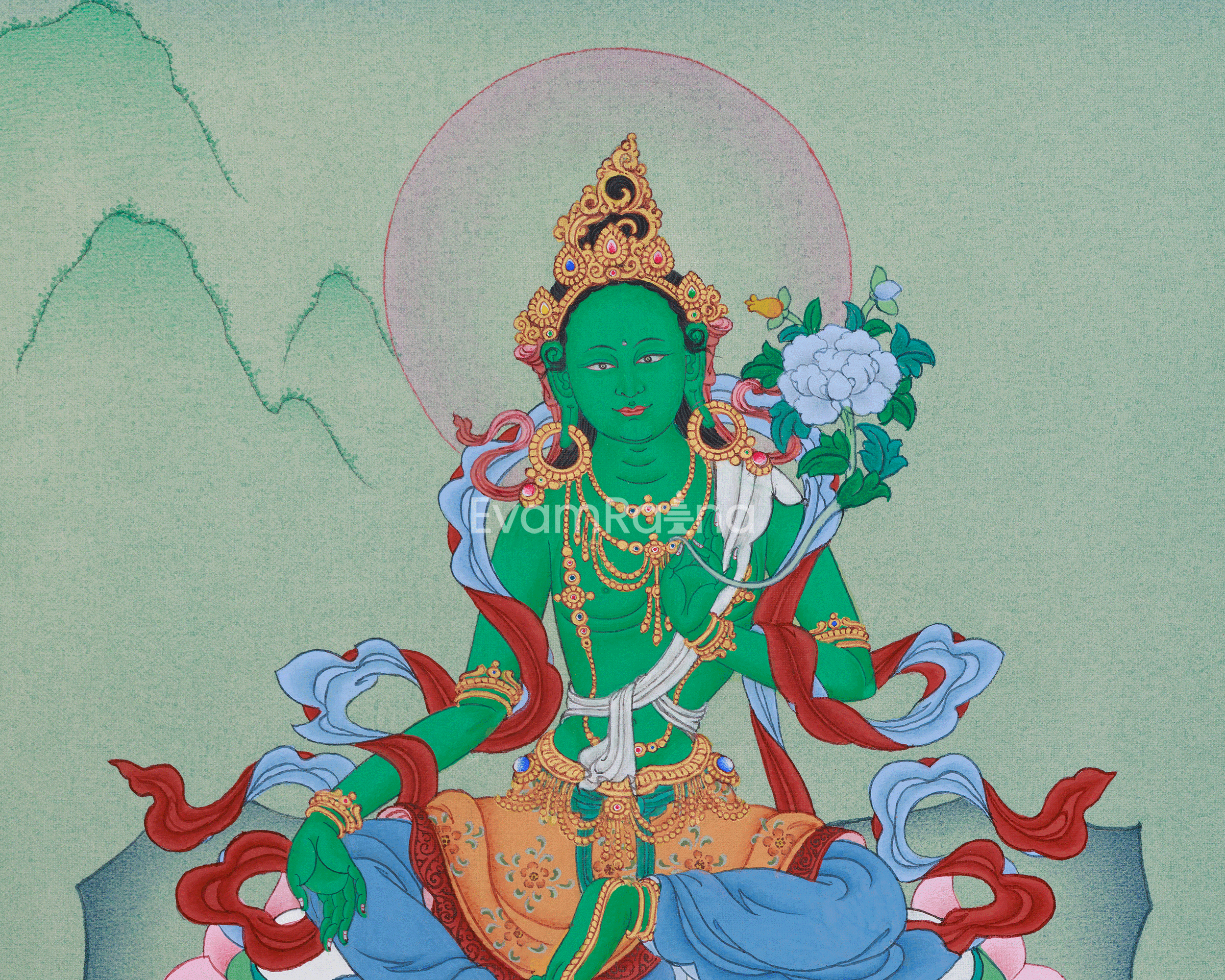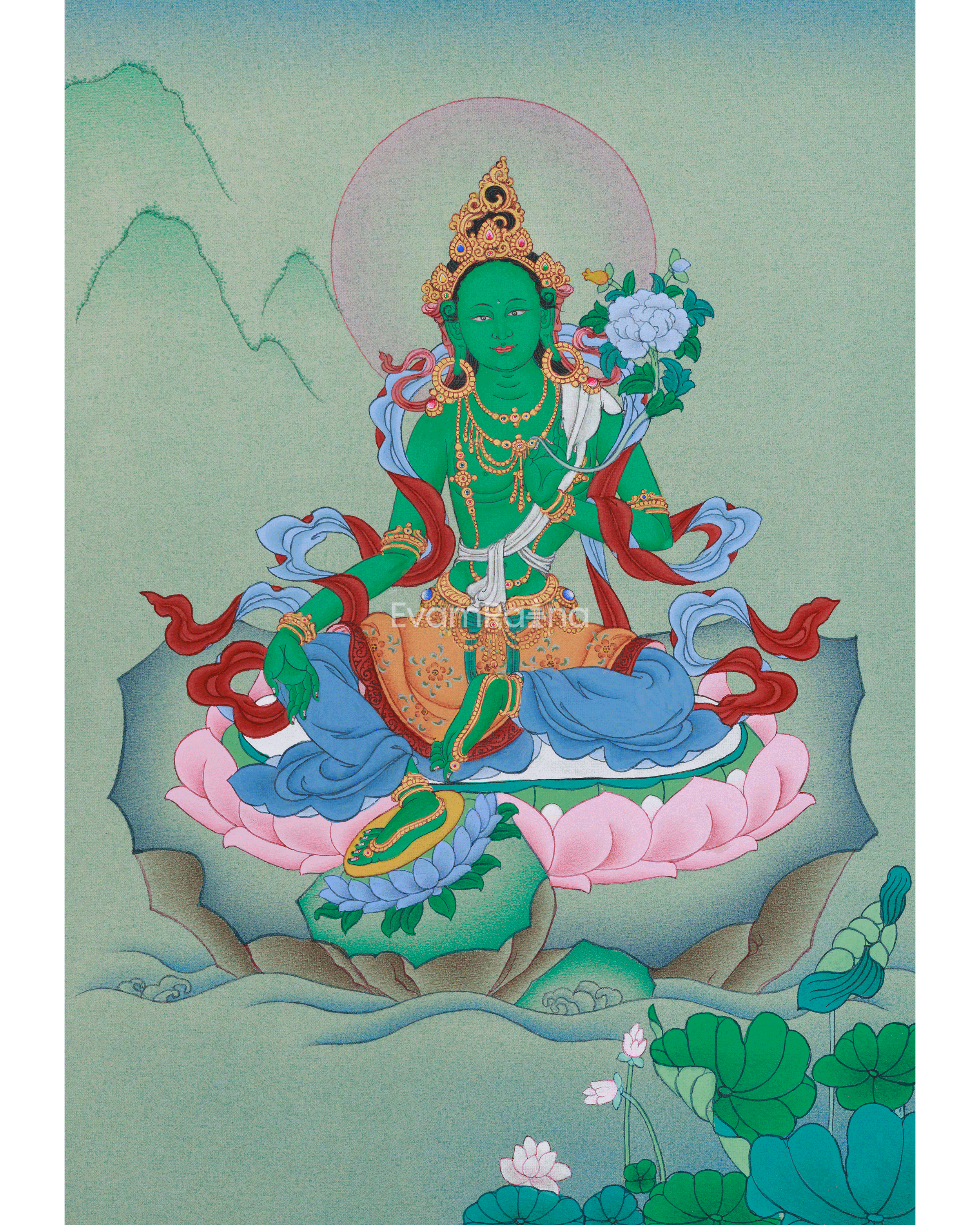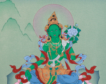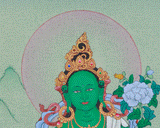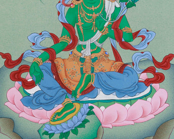 Green Tara, also revered as the Supreme Mother Jetsun Dolma, embodies compassion, healing, and protection. A cherished Tibetan Buddhist deity, she is known for quick help in distress. Devotees invoke her for safety, peace, abundance, and tranquility. This Thangka depicts her serene, kind nature, reclining on a lotus symbolizing virtues and enlightenment. Her green skin reflects compassion, showing her ability to assist and alleviate suffering.