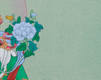 This Thangka features high-quality cotton canvas, allowing it to breathe and age well. Gold accents highlight sacred features like halos, crowns, and jewelry. Colors come from natural stone pigments, used for centuries in Tibetan art, creating vibrant, durable hues for her skin, clothing, and floral patterns. Created in the traditional Karma Gadri style, known for delicate line work and realism, it emphasizes facial features, postures, and divine attributes with subtle shading for depth.