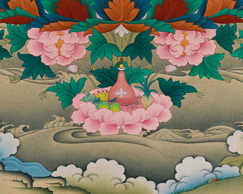 A Thangka depicting Padmasambhava, a spiritual leader, is a vital representation of one of the most venerated figures within Tibetan Buddhism. To ensure durability and authenticity, this Thangka was carefully hand-painted in our studio using premium cotton canvas, 24K gold, and natural Lhasa stones. This artwork employs the Tibetan Buddhist painting technique known as Karma Gadri, distinguished for its clarity, elegance, and intricate detailing. Karma Gadri art, historically used for religious and meditative purposes, is characterized by symmetrical line work, vivid colors, and spiritual imagery that evoke a tranquil yet powerful atmosphere.