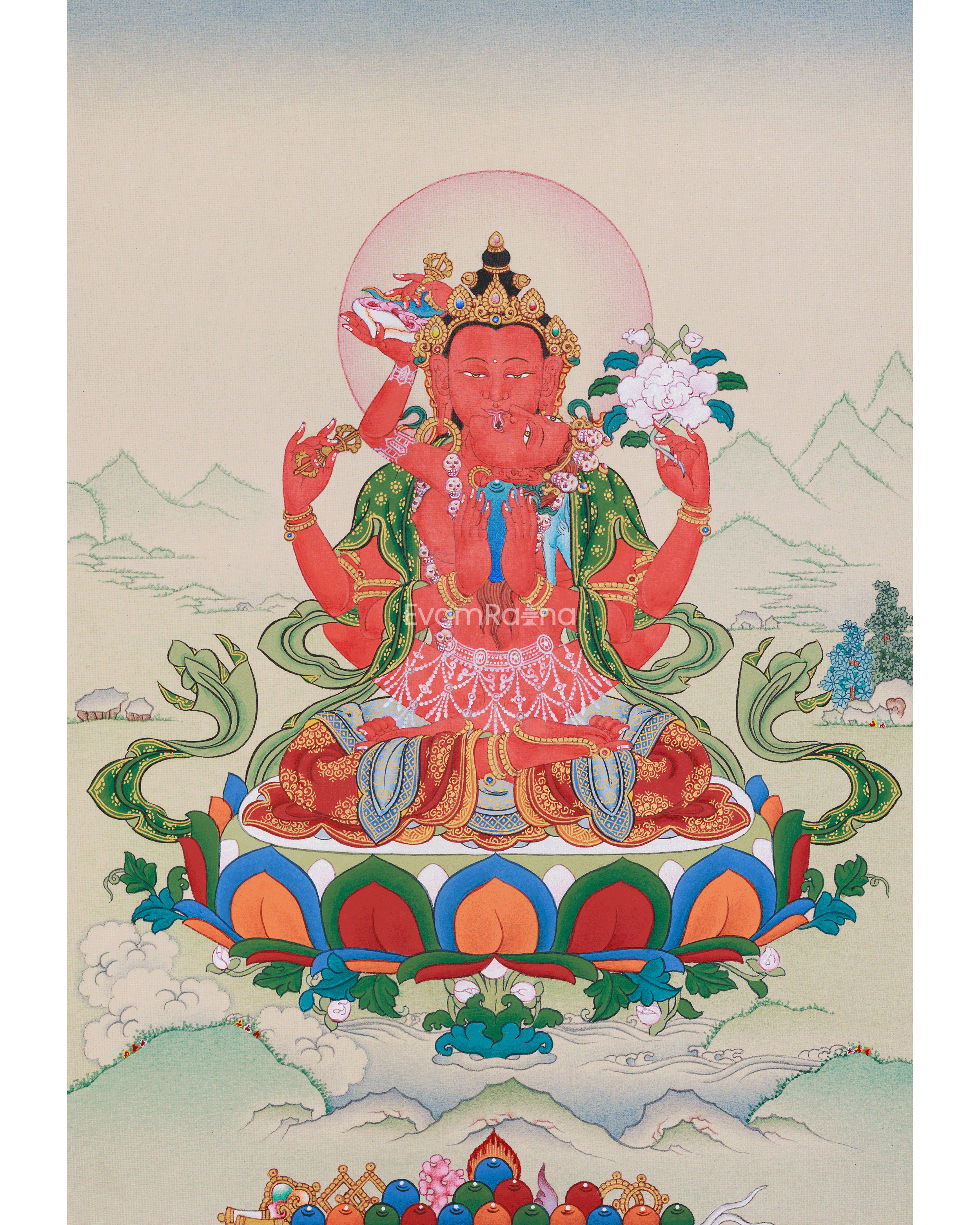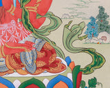 This red form of Chenrezig, the Bodhisattva of Infinite Compassion, represents the harmony of compassion and wisdom. He is depicted holding his consort, underscoring the inseparable bond between method and insight—the core of enlightenment. His glowing red body emits warmth and divine love, while the lotus throne beneath him symbolizes purity rising from worldly suffering. The detailed elements, including the vajra, wish-fulfilling jewel, and blooming lotus, showcase his divine qualities and enlightened mind. This Red Chenrezig with Consort Thangka serves as a symbol of spiritual awakening and sacred unity. Place it in your home or meditation space to invite blessings of compassion, harmony, and transformation.