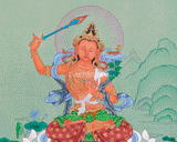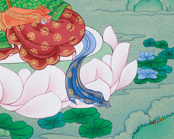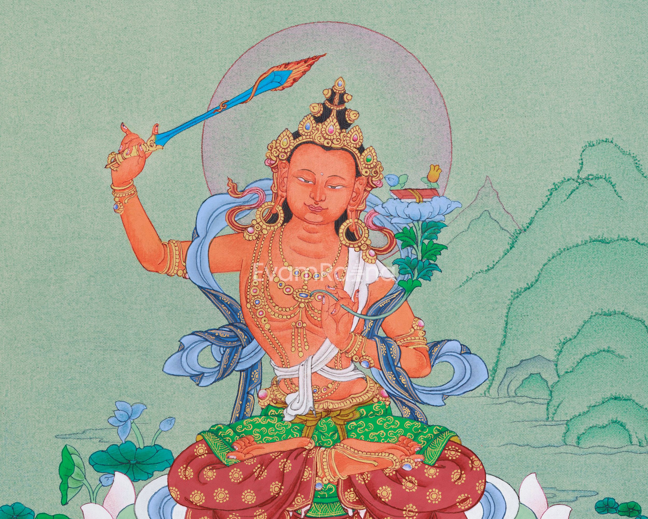 In this thangka, his body is wrapped in a flowing silken scarf, emphasizing his divine and elegant appearance. He sits on a blooming lotus throne, symbolizing purity, spiritual awakening, and detachment from worldly illusions. In his right hand, he holds a fiery sword of wisdom, raised to cut through ignorance and negative thoughts. The Prajnaparamita Sutra rests on a lotus flower in his left hand. A radiant halo behind him highlights his serene yet commanding presence. The calm mountainous landscape, filled with lush greenery in the background, depicts the enlightened realm of wisdom and a peaceful meditative state. This thangka, displayed in a meditation space, altar, or sacred corner, serves as a potent reminder to cultivate compassion, wisdom, and inner peace.