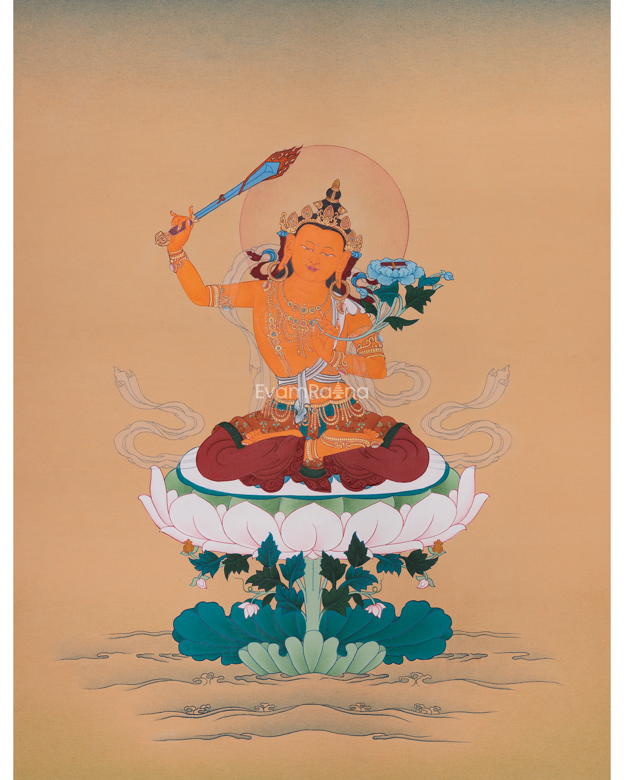 In Buddhist tradition, Manjushri is revered as the Bodhisattva of Transcendent Wisdom, representing insight, clarity, and the power of enlightened knowledge. He is often called upon to dispel ignorance and guide practitioners toward profound understanding. In one hand, he holds a flaming sword of wisdom, cutting through delusion with clarity. In the other, he gently cradles a lotus, supporting the Prajnaparamita scripture, which symbolizes the depths of wisdom teachings. This imagery beautifully illustrates his role as a beacon of knowledge and compassion. In this thangka, he sits gracefully on a lotus throne, his calm expression illuminated by radiant shades of gold and orange that signify his enlightened brilliance. This sacred Manjushri depiction is a spiritual icon and an inspiring piece of art that invites wisdom, clarity, and inner awakening into any space.