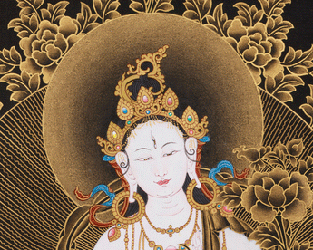 Discover an exquisite Tibetan White Tara Goddess Thangka, beautifully hand-painted on high-quality cotton canvas using vibrant acrylic colors and enhanced with genuine 24K gold. Created in the Nakthang (Gold on Black) style, this painting features radiant golden lines that bring the deity to life against a black background, symbolizing the harmony of wisdom and emptiness. With their intricate floral designs, shimmering details, and the golden lotus throne, the jewelry and robes embody the workmanship of this unique tradition. The result is a breathtaking and spiritually significant work of art that resonates deeply with the heart.