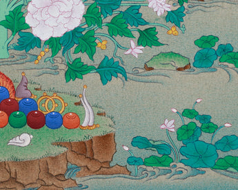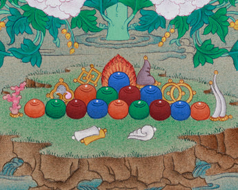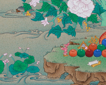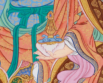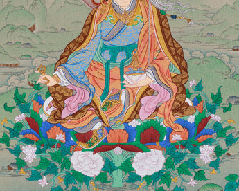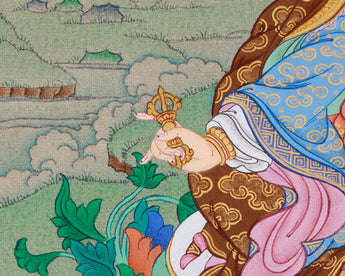 Traditional Guru Rinpoche artwork beautifully depicts Padmasambhava, often referred to as the "Second Buddha" in Tibetan Buddhism. This thangka is hand-painted with natural stone colors, a traditional process that adds richness and depth to the artwork, reflecting centuries of Tibetan artistry. The use of genuine 24K gold throughout the painting enhances its spiritual significance and Guru Rinpoche's celestial presence. The painting is on durable, high-quality cotton canvas, displaying detailed brilliance. The thangka is created in the renowned Karma Gadri style, known for its precise lines and detailed iconography, making it a spiritual and visually appealing masterpiece.