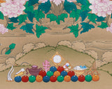 The skillful application of Lhasa stone colors imparts a luminous vibrancy to each figure. At the same time, the 24K gold accents highlight the sacred qualities, such as the lotus flowers and glowing halos. This thangka is a spiritual gateway, symbolizing Guru Rinpoche’s commitment to guiding practitioners, clearing obstacles, and leading beings to enlightenment.