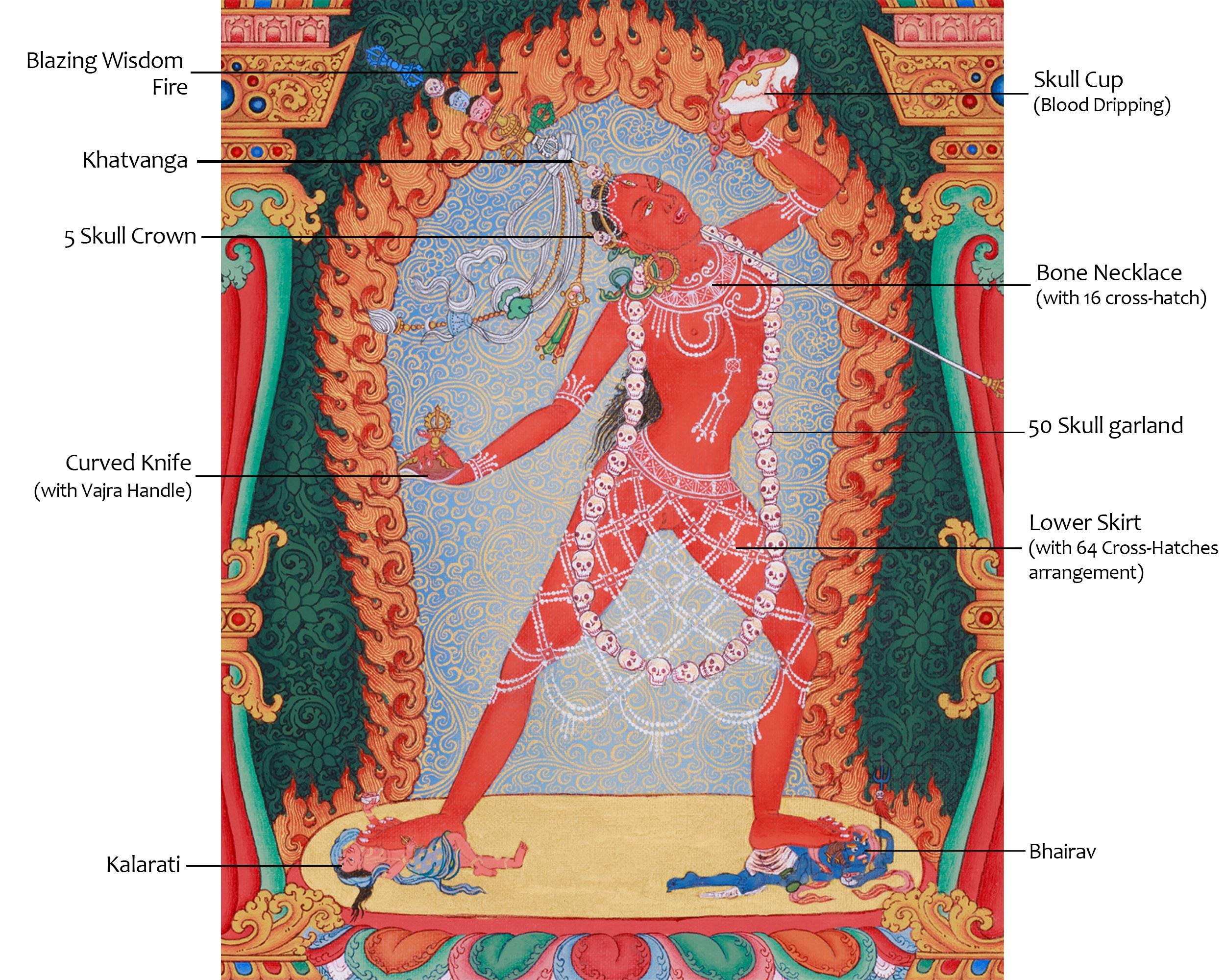 Vajrayogini, revered across Vajrayana traditions, is celebrated as the ultimate female deity of tantric Buddhism, embodying wisdom and fearless compassion. Known as the Dakini of Transformation, she symbolizes the union of bliss and emptiness, guiding practitioners toward liberation through realization. Her fiery red appearance radiates transformative energy, and her lively posture, along with her fierce yet caring expression, reflects her fearless power to dissolve ignorance and ego. For centuries, Vajrayogini has been revered as the secret essence of all female Buddhas, with her practice seen as a swift path to enlightenment.