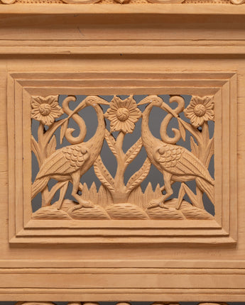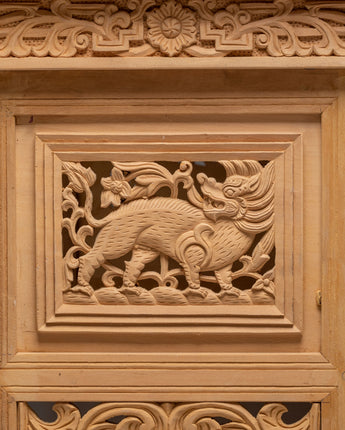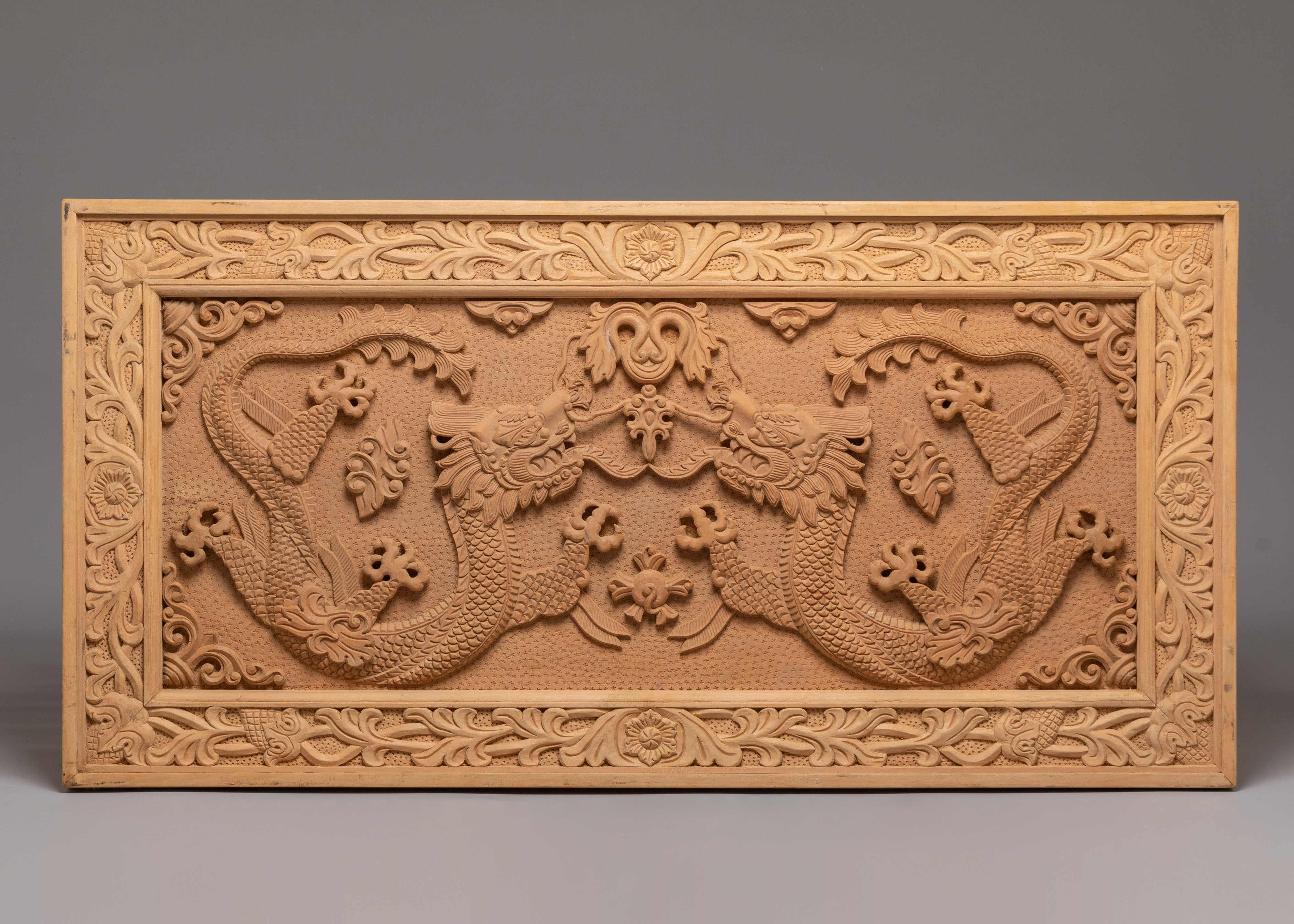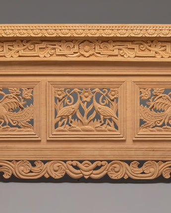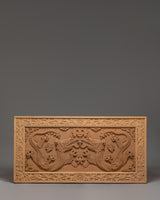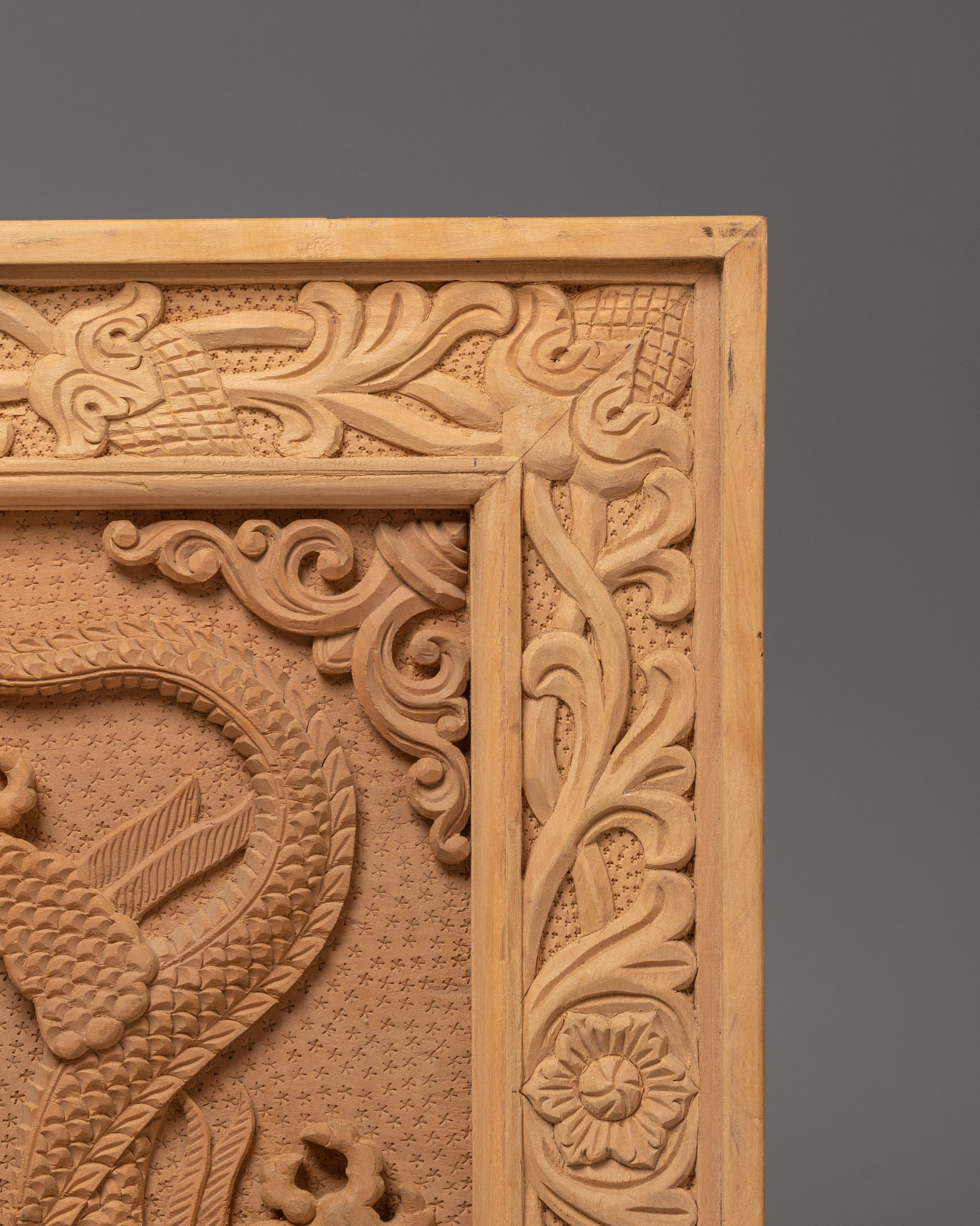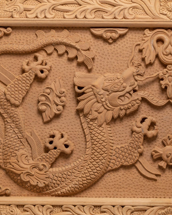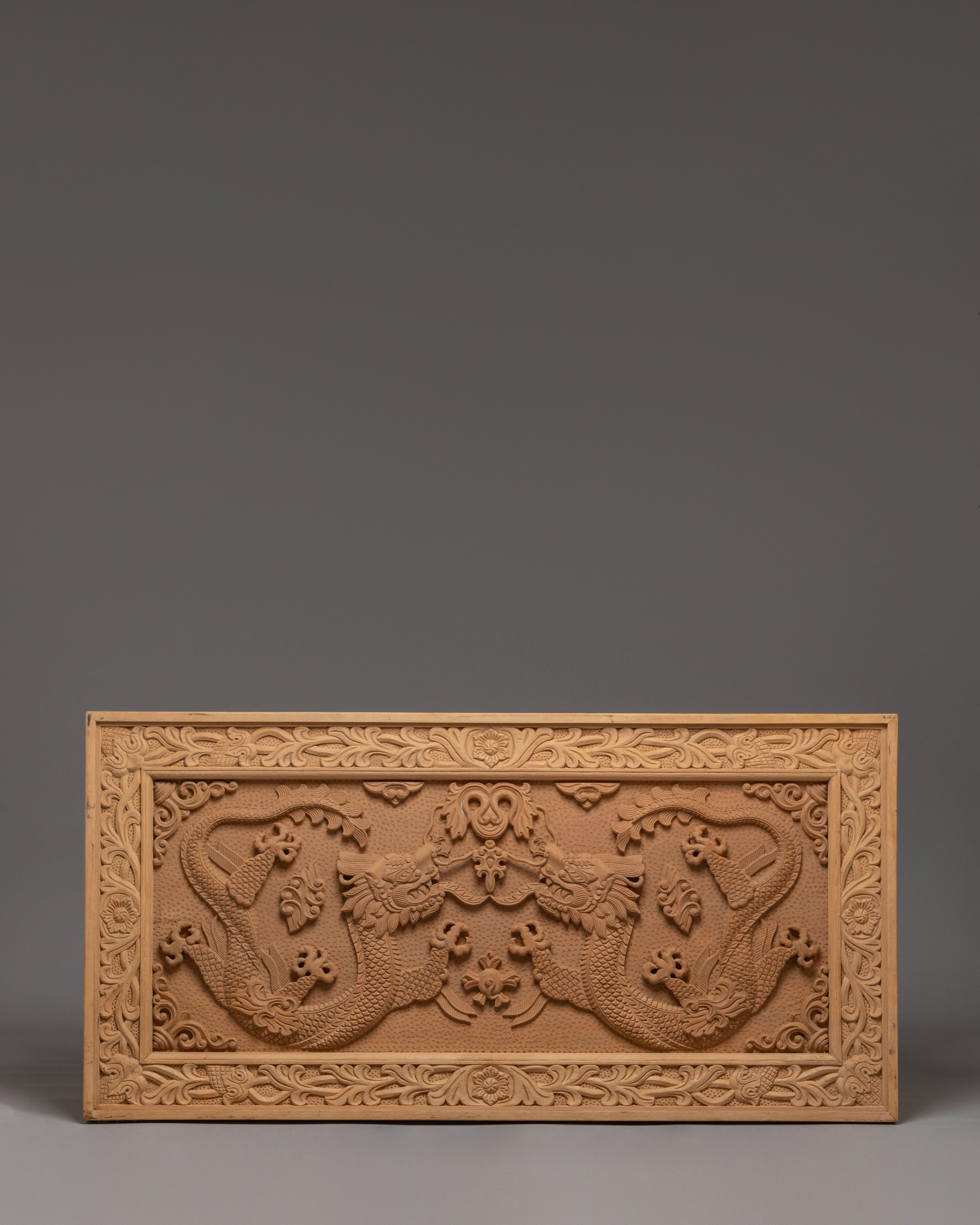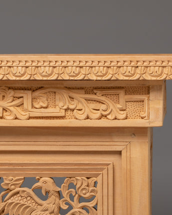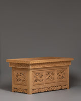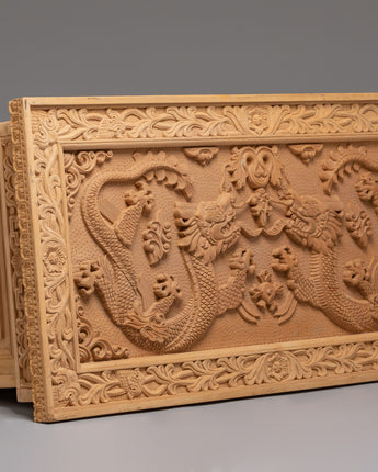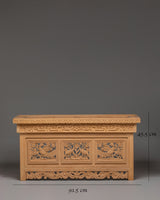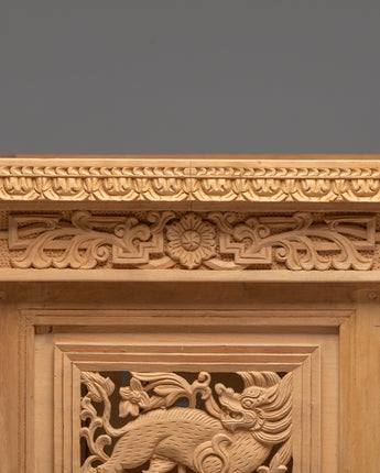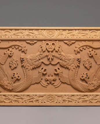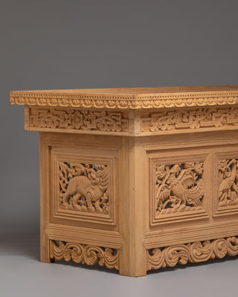 The front carving on this table shows two traditional dragons facing each other, carved in a balanced and symmetrical way. In Tibetan and Himalayan art, dragons symbolize power, protection, wisdom, and good fortune. The Front facing position represents balance, harmony, and unity, guarding the space where the table is used. Between them are floral and leaf motifs, which stand for purity, growth, and positive energy. The surrounding carved borders act as a protective frame, meaning safety and completeness. Overall, the iconography reflects strength, spiritual protection, and calm energy, making the table ideal for meditation, prayer, or peaceful home use.