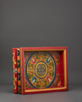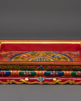 The Wooden Tibetan Tray is a beautifully carved tray suitable for spiritual rituals and offerings. This magnificent piece is 10cm high and 41cm wide, with a side width of 31cm, providing a balanced and expansive surface for your rituals. This tray is both utilitarian and ornamental, making it ideal for Tibetan Buddhist rituals, meditation activities, or simply adding to your altar area. This tray, crafted from solid wood and accented with brilliant acrylic colors, serves as a stunning backdrop for all your spiritual practices.