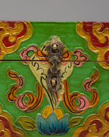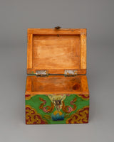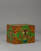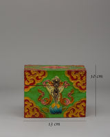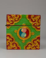 Handcrafted Tibetan altar Tibetan box for holding prayer beads, incense, and other spiritual items. This little yet exquisite box, measuring 10cm in height and 13cm in breadth, is made of high-quality wood and embellished with brilliant hand-painted acrylic color that reflects Tibet's rich artistic legacy.