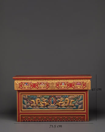 This Tibetan Folding Table for Home Decor is a handcrafted wooden altar piece painted in brilliant acrylic colors. This remarkable table, measuring 41cm in height and 71.5cm at the base, has a side width of 38cm and mixes functionality with spiritual artistry. The exquisite designs incorporate auspicious motifs and symbolic iconography that reflect Tibetan culture and spirituality, making it a focal point in any meditation or living environment.