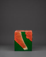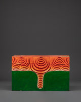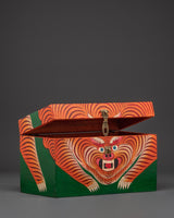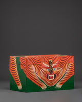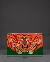 This hand-painted Tibetan guardian box brings striking protection and character to your environment. Made from wood and meticulously hand-painted with vivid acrylic colors, it features a striking red and green design centered on a formidable guardian figure, possibly inspired by Tibetan Snow Lions or temple protectors. This box, characterized by wide eyes, flaring whiskers, and extended claws, encapsulates the essence of repelling negativity. And it attracts some attention in the process!