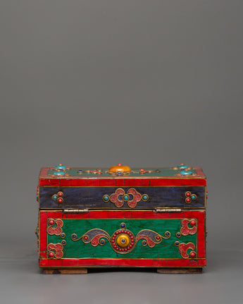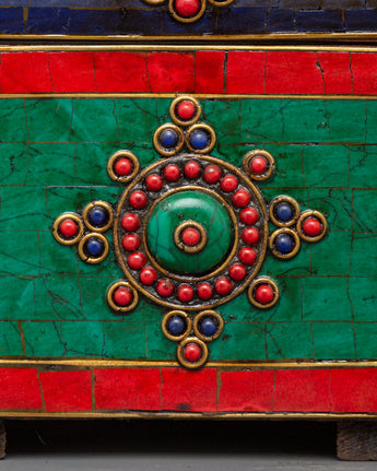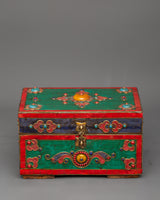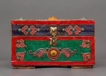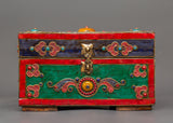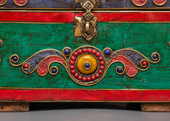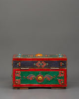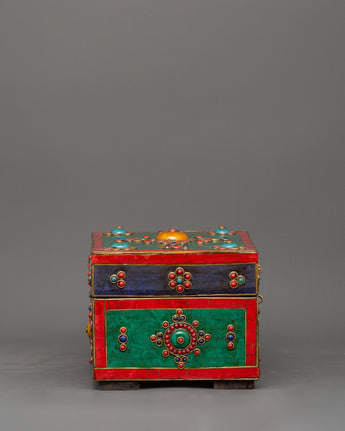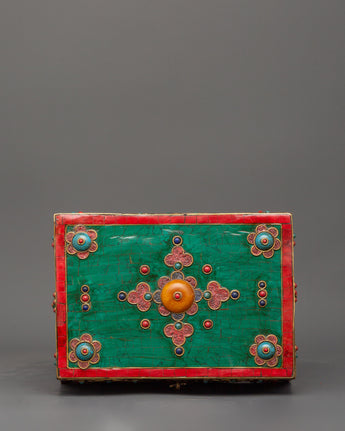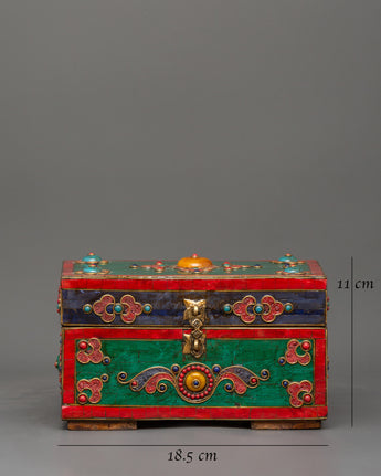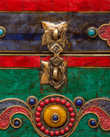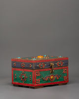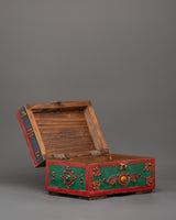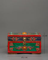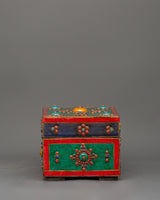 This Hand-Painted Tibetan wooden box is perfect for storing precious treasures or accessories. It has rich traditional designs, brilliant acrylic colors, and elaborate brass fittings. This finely carved piece, measuring 18.5cm broad by 11cm tall and weighing 0.72kg, is perfect for storing prayer beads, jewelry, incense, or other significant objects. Its vibrant green, red, and blue color scheme echoes traditional Himalayan art, while the brass lock and inlay details offer a polished spiritual touch.