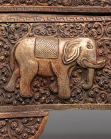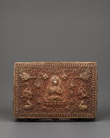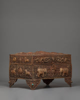 The box's exterior is covered with complex carvings of dragons and elephants, each expressing a depth of spiritual meaning. Dragons, guardians of wisdom and heavenly power, are thought to fend off evil and safeguard holy treasures. The elephants, which represent power, stability, and spiritual endurance, stand gracefully at the base, grounding the box's vitality. A Buddha image sits in the center, exuding peace and enlightenment, surrounded by floral and scroll patterns that represent balance and cosmic harmony. The precise craftsmanship on each panel demonstrates the artisan's dedication and mastery of traditional Tibetan metallurgy.
