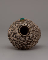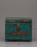 This magnificent Handmade Wooden Tibetan Box With Sankha is a breathtaking combination of beauty and spiritual meaning. The wood box is embellished with skillfully inlaid imitation turquoise stones that exude a lively and earthy charm. This combination, complete with a wonderfully carved conch shell of 80% silver and 20% copper, represents sacred music and purity in Tibetan culture. The box, which measures 15.5cm in height and 18cm in width, offers a secure and stylish home for the conch shell, making it a great addition to your spiritual practice or home décor.