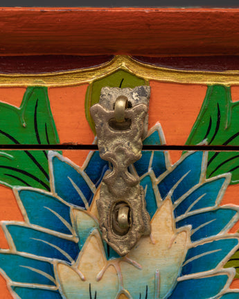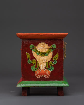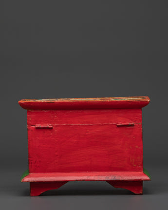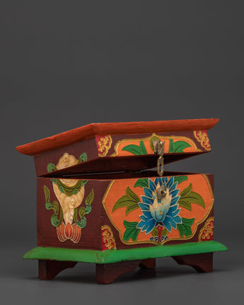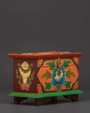 Every detail shows true Tibetan craftsmanship, making it a significant gift or collector's piece for individuals who enjoy spiritual home decor and ethnic culture. Storage solutions.  This handcrafted Tibetan storage box will add enduring value and appeal to your interiors, making it ideal for individuals seeking one-of-a-kind wooden keepsake boxes, hand-painted Tibetan decor, or traditional jewelry storage solutions.