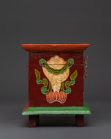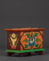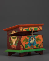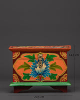 Every detail shows true Tibetan craftsmanship, making it a significant gift or collector's piece for individuals who enjoy spiritual home decor and ethnic culture. Storage solutions. This handcrafted Tibetan storage box will add enduring value and appeal to your interiors, making it ideal for individuals seeking one-of-a-kind wooden keepsake boxes, hand-painted Tibetan decor, or traditional jewelry storage solutions.