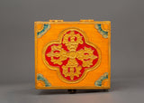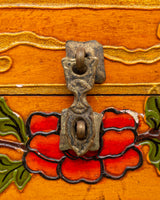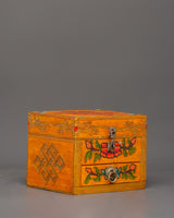 Add a vibrant touch of Himalayan history to your sacred space with this Hand-Painted Tibetan Wooden Box, which features two drawers and intricate artwork. This practical chest measures 14cm wide by 12cm high and weighs 0.61kg, making it ideal for storing jewelry, prayer beads, incense, or small ritual objects. The box is adorned in rich golden tones with red and green colors showcasing blooming flower motifs on the front and a powerful vajra symbol on top, representing spiritual strength and transformation.