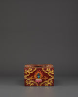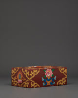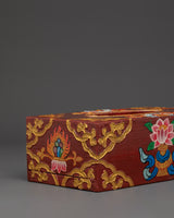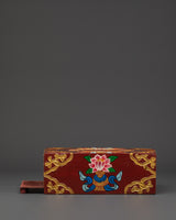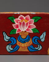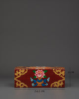 This Tibetan handcrafted tissue box measures 9 cm in height and 24.5 cm in width, weighing 0.49 kg. Made from wood and adorned with colorful acrylic paint, this box brings both beauty and functionality to your home or sacred space. Its compact size fits comfortably on tables, desks, or altar setups, keeping tissues accessible in style.