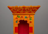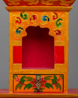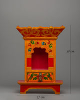 Wooden altar temple, which brings tranquility and devotion into your home. This pooja mandir, measuring 38cm in height and 27cm in width, is ideal for storing idols, incense, and other precious items. Crafted from premium wood and embellished with brilliant hand-painted acrylic hues, it offers any worship space a classic yet stylish touch.