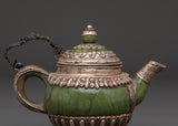 This Tibetan aesthetic silver teapot is a refined blend of spiritual artistry and cultural heritage. Crafted with a height of 9 cm and a width of 12.5 cm, it features a graceful design adorned with jade, symbolizing purity and harmony. This piece is not only a functional item but also a sacred vessel used in Tibetan Buddhist tea offerings and altar ceremonies.