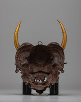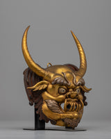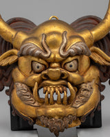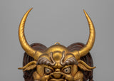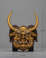 This incredible Tibetan mask is a powerful present of traditional Tibetan quality workmanship, made of copper and perfectly plated in gold, Silver inlay on eyes. The mask's elaborate design depicts a furious attitude, with large, wide eyes and exaggerated facial features conveying a sense of protection and power. The horns that rise magnificently from the top of the mask add to its commanding presence, reflecting the mythical and spiritual significance of such masks in Tibetan culture, where they are frequently employed to ward off evil forces or during religious rituals.