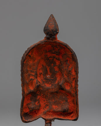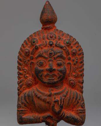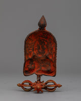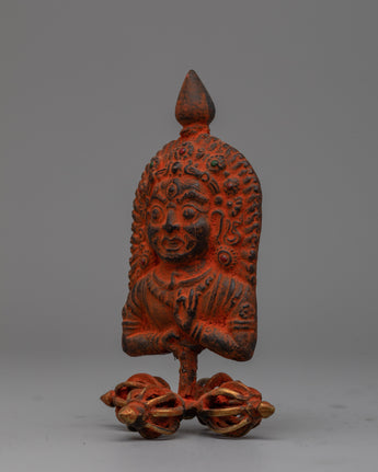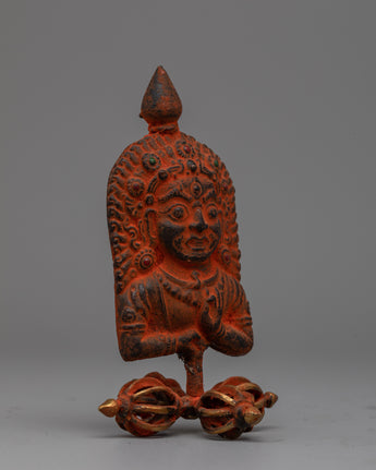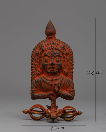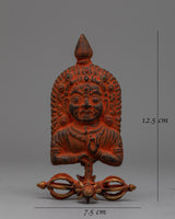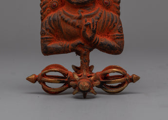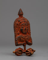 Crafted from copper, the Bhairav Copper Art is beautifully handcrafted, highlighting the metalwork's elaborate creativity. At the bottom of this artwork, a finely detailed Vishwa Vajra, signifying the cosmic strength and protection connected with this sacred insignia, is located. The Vajra represents the unflappable power of truth and enlightenment.