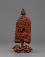 The face of Bhairav, prominently exhibited at the top of the sculpture, perfectly captures this deity's aggressive and protective nature. Bhairav is portrayed in exquisite detail, emulating power and alertness. He is well-known for his function as a protector and slayer of evil energies. This remarkable copper art is a great addition to any decorative or spiritual collection since it incorporates these potent symbols into a single, eye-catching design.