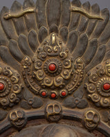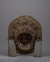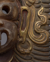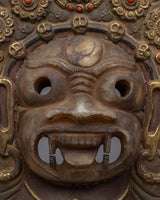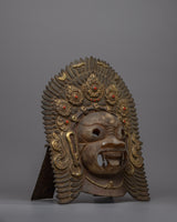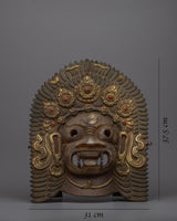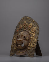 The powerful deity Bhairav, a fierce guardian and important figure in Buddhist and Hindu religions, sits at the center of this piece of art. Semi-precious coral stones have been expertly inlaid to add to the mask's aesthetic appeal and spiritual importance. The meticulous craftsmanship of every component, including the elaborate ornamentation and intricate facial characteristics, elevates this mask to a true masterpiece that combines artistic beauty with a rich cultural legacy.