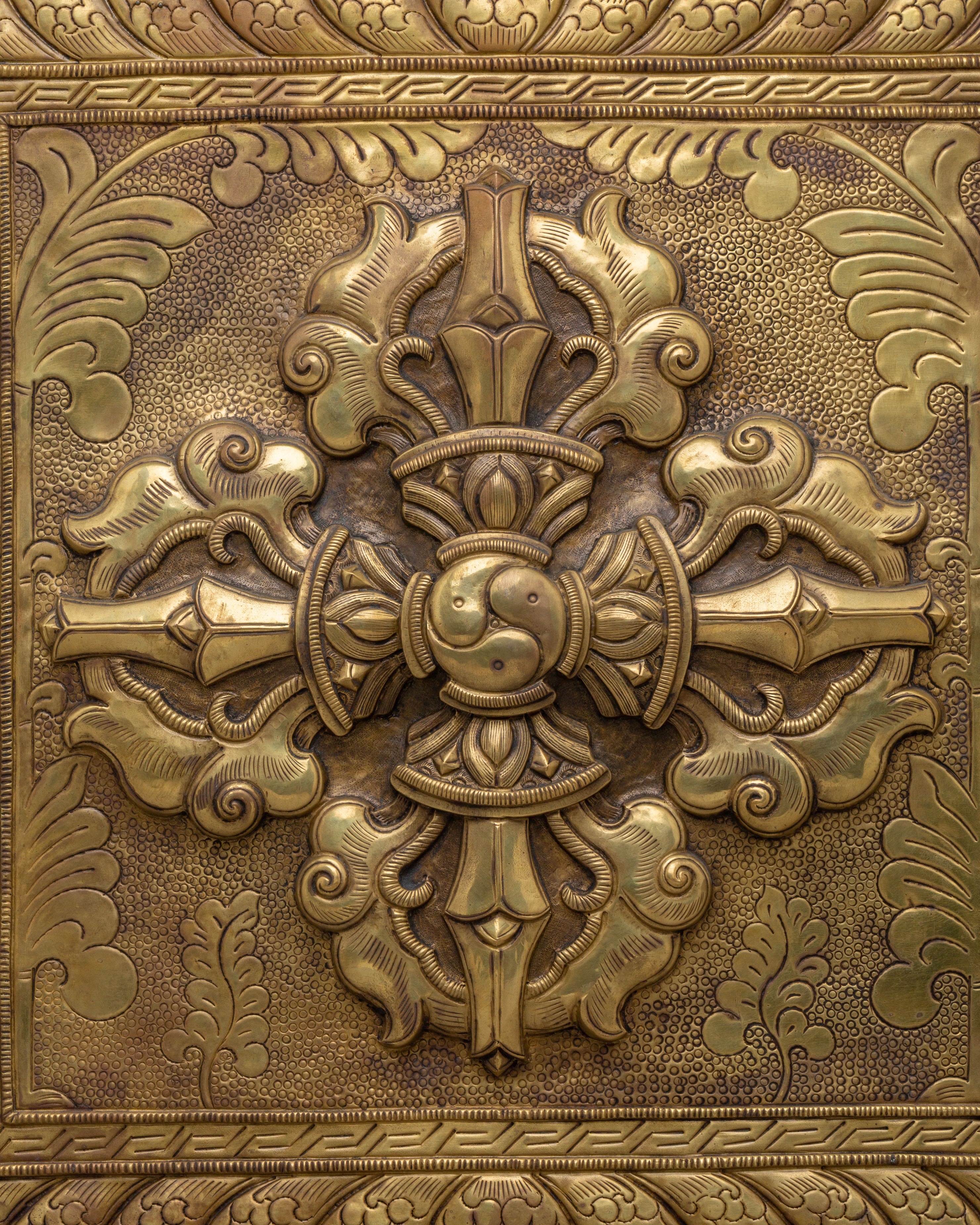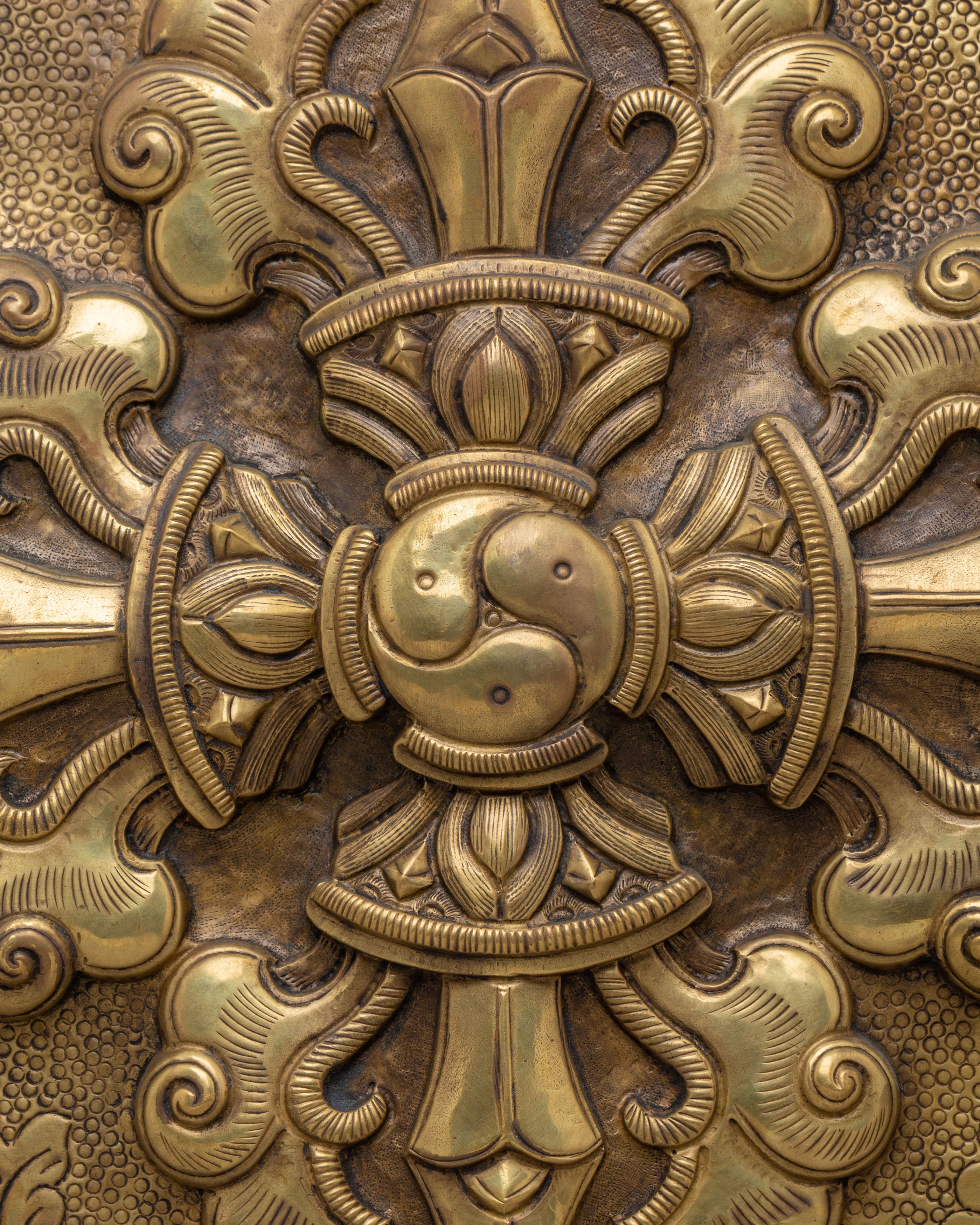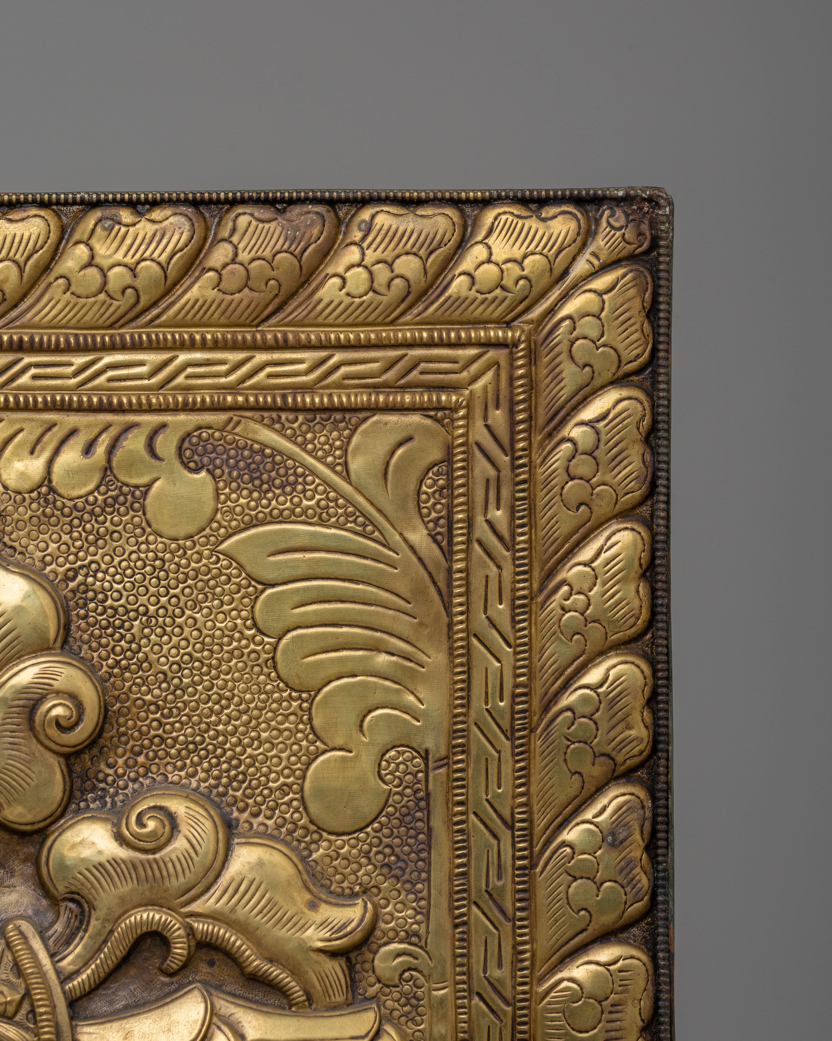 The Vajra at the center of this design represents the union of wisdom and compassion, its form often symbolizing the thunderbolt that destroys ignorance while the lotus petals represent purity and enlightenment. The filigree design and detailed carvings surrounding the Vajra enhance its spiritual significance, creating an intricate piece of art that resonates with positive energy. The copper material adds depth and warmth to the sculpture, making it an eye-catching focal point in any spiritual space.