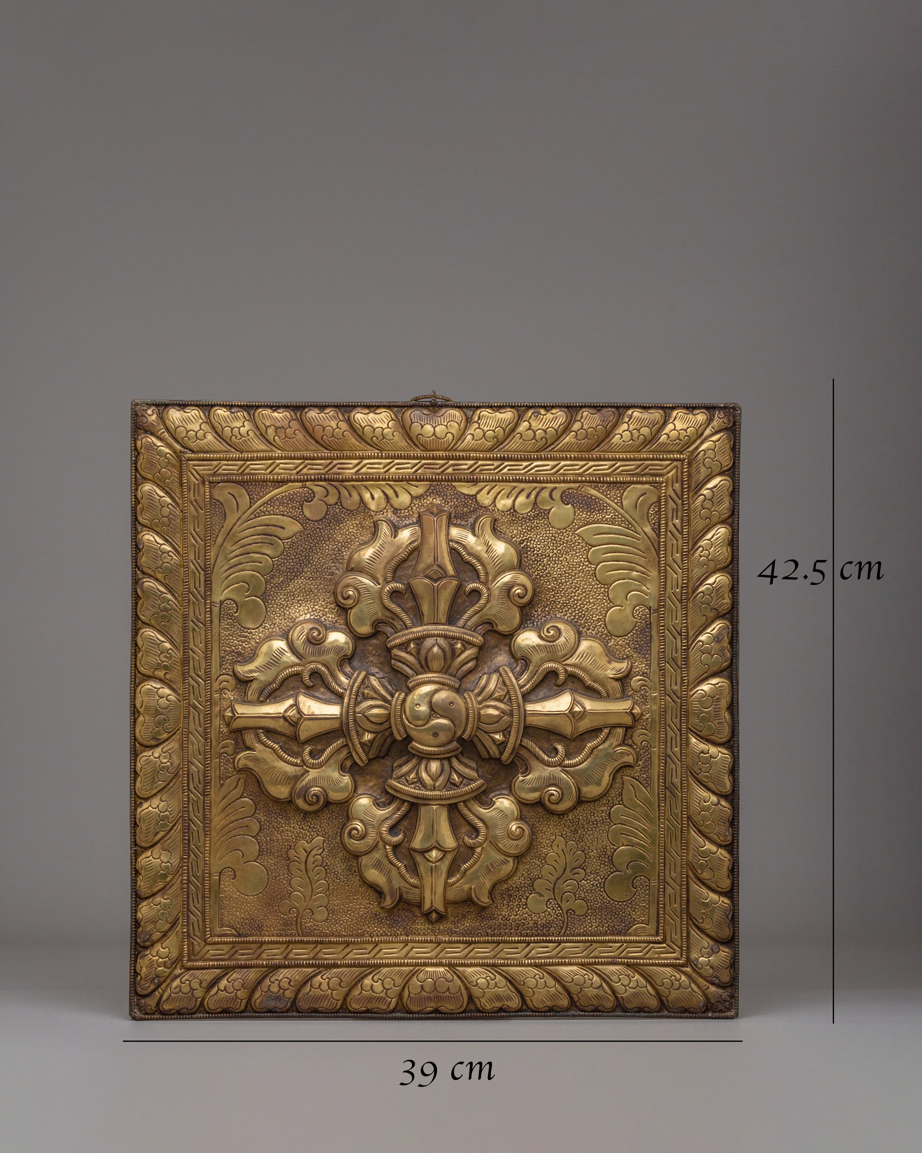 The Copper Bishwo Vajra Wall Hanging is a sacred representation of the Vajra, one of the most powerful symbols in Tibetan Buddhism, representing spiritual power, protection, and indestructible truth. Measuring 42.5 cm in height and 39 cm in width, and weighing 1.196 kg, this beautifully crafted wall hanging is made from copper, showcasing intricate detailing and traditional Himalayan artistry. The Bishwo Vajra, or World Vajra, is a symbol of the unbreakable force of enlightenment, making this piece a meaningful addition to meditation spaces, altars, or sacred rooms.