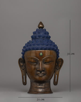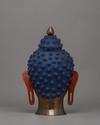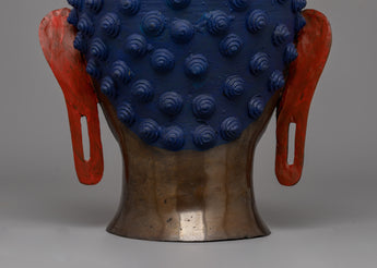 The Bronze Buddha Head Statue is a wonderfully created sculpture that captures the Buddha's tranquility and wisdom. This statue is constructed of oxidized bronze and is 31 cm in height and 21 cm in width, weighing 2.39 kg. It has a timeless and ancient aspect. Adding acrylic paint improves its appearance, with the Buddha's hair's bright blue curls standing out in stark contrast to the golden body. The beautifully crafted facial expression oozes serenity and spirituality, making it an ideal depiction of contemplative tranquility.