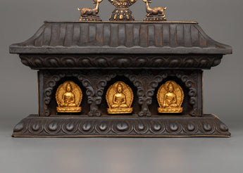 This Buddha Set with a Wooden Altar Box is a remarkable piece of spiritual decor, perfect for meditation spaces, shrines, or home altars. The collection features three sculpted, gold-plated Buddha figures housed in an artistically carved wooden altar box. With a height of 26 cm and a width of 34 cm, this set weighs 2.27 kg and is meticulously crafted from copper, wood, and gold plating, making it ideal for any altar shrine decor.