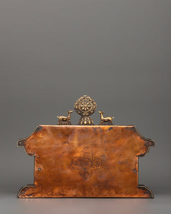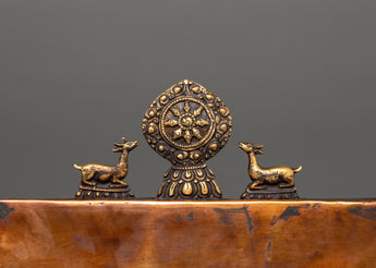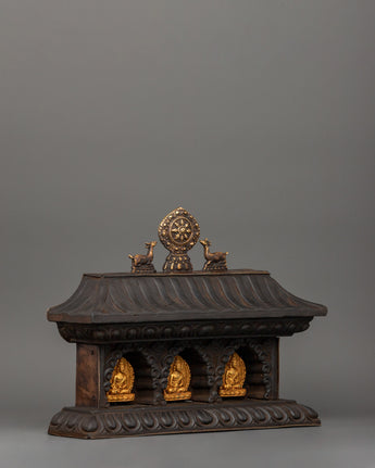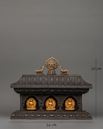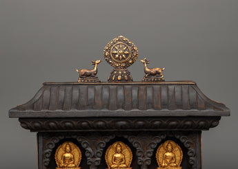 The altar box also depicts a Wheel of Dharma with two deer on both sides, a common Buddhist symbol. It honors the Buddha’s first teaching in Deer Park, Sarnath, where he began imparting his wisdom. The wheel represents Buddhist teachings, while the deer symbolizes peace, kindness, and a willingness to learn. This symbol is often found on Tibetan monastery rooftops as a reminder of wisdom and enlightenment. The golden Buddha figures below enhance the sacred meaning, reflecting devotion to the Buddha’s teachings.