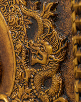 This Relief art of Shakyamuni Buddha is a lovely piece of wood ply art. The deity of Shakyamuni Buddha is crafted from clay and expertly painted in the artwork. A fiber border surrounds the artwork, adding an attractive touch to the piece. Shakyamuni Buddha, also known as Gautama Buddha, is shown meditating with his hands in the Dhyana mudra. The detailed intricacies of the statue, as well as the compassionate smile on the Buddha's face, make this work a lovely addition to any collection of spiritual art.