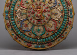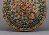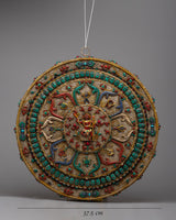The Buddhist Copper Mandala Wall Hanging is a magnificent mix of spiritual symbolism and artisanal skill, expertly crafted on a copper body with painstaking attention to detail. Its exquisite pattern incorporates precious stones such as turquoise, coral, and lapis lazuli, which have been carefully inlaid to create cosmic harmony and spiritual resonance. These brilliant colors not only catch the sight, but also reflect enlightenment and peace.