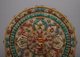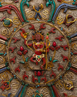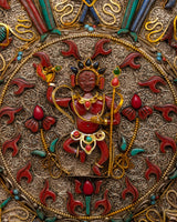 The mandala is embellished with delicate filigree work, which adds intricacy and elegance to the design. The numerous patterns and motifs woven into the filigree add to the mandala's visual appeal, enabling viewers to become immersed in its rich beauty. A masterfully constructed deity surrounded by auspicious symbols serves as the mandala's focal point, capturing the viewer's attention and inspiring study of the profound truths contained inside.