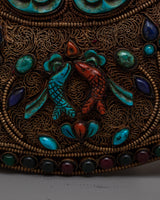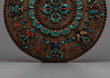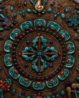 Immerse yourself in the spiritual depths of the Buddhist Copper Mandala, which showcases meticulous craftsmanship and sacred symbolism. Handcrafted on a shiny copper body and accented with rich electro-gold plating, this mandala features beautifully inlaid artificial coral, lapis lazuli stones, and a conch shell, each element carefully picked for its spiritual meaning.
