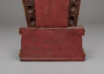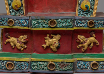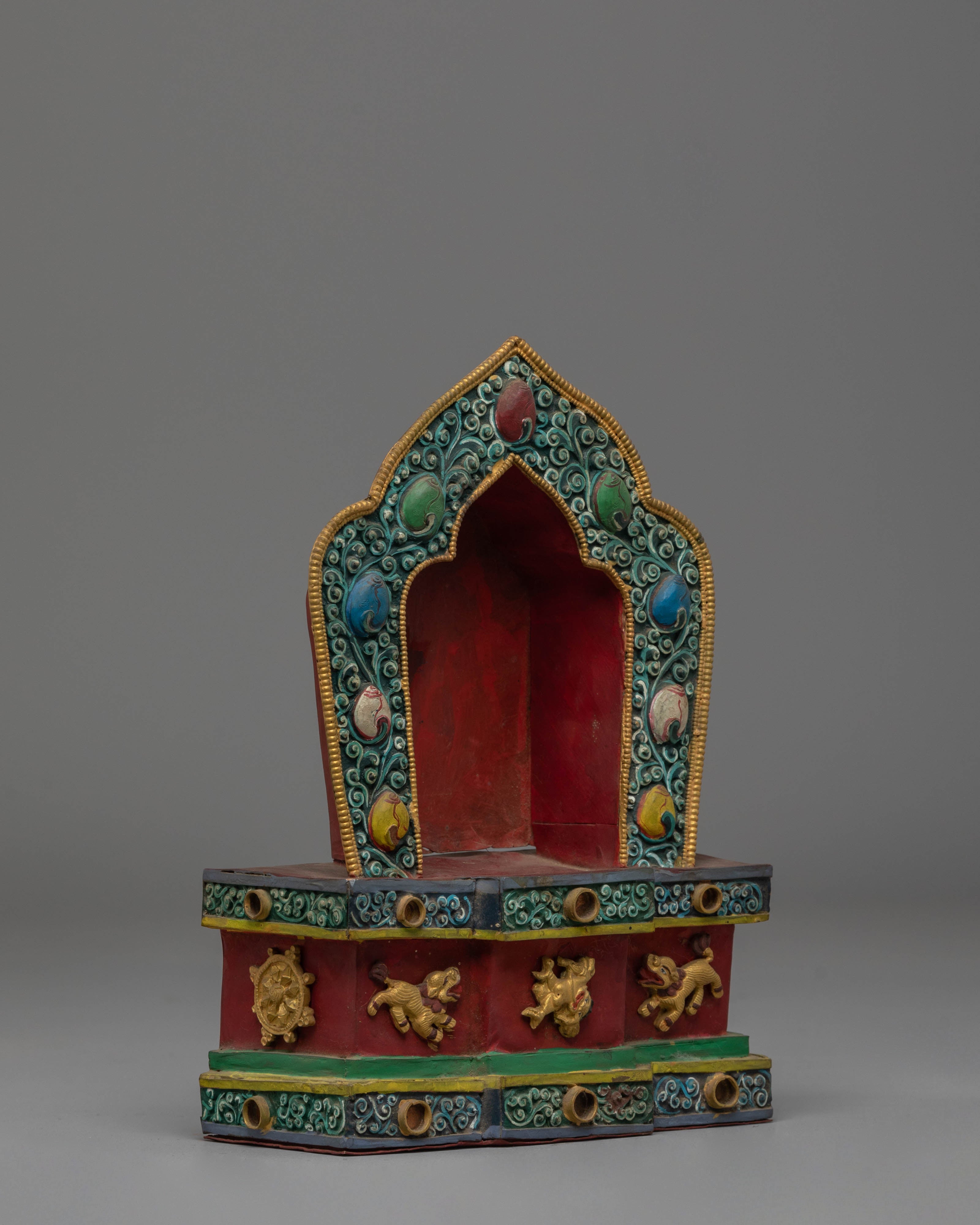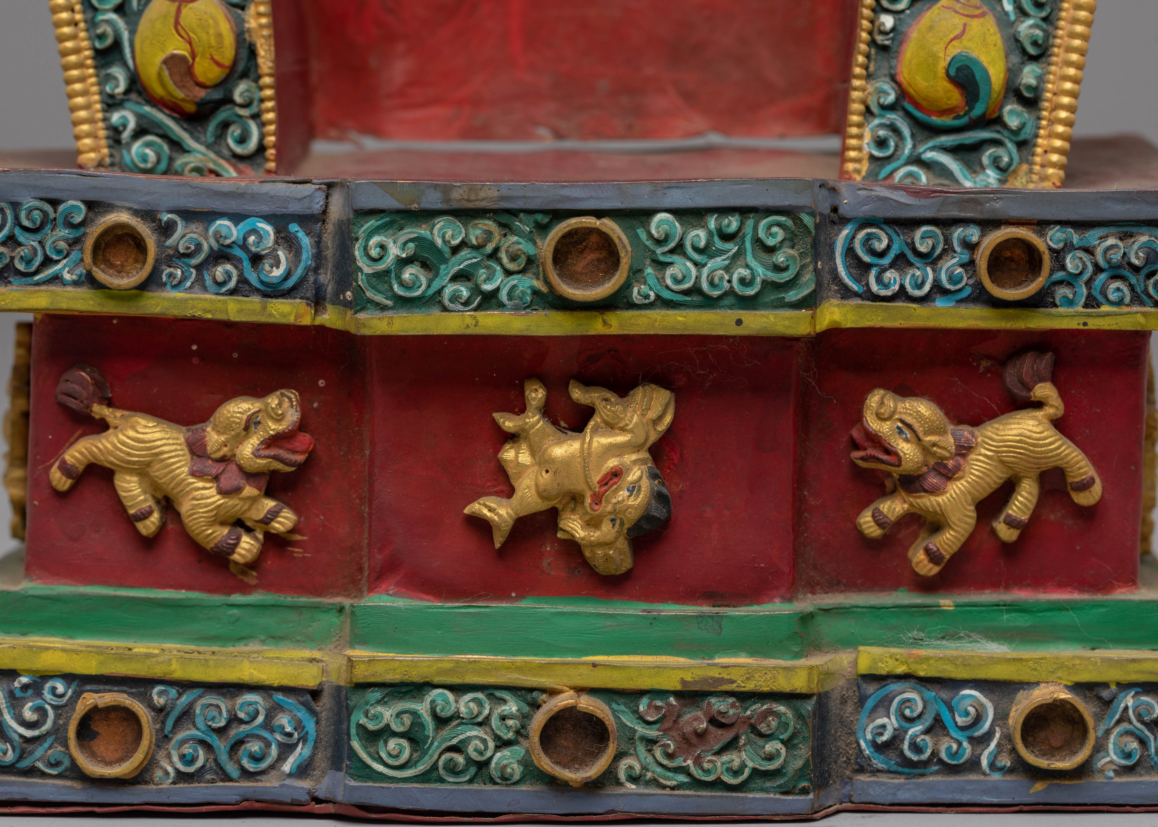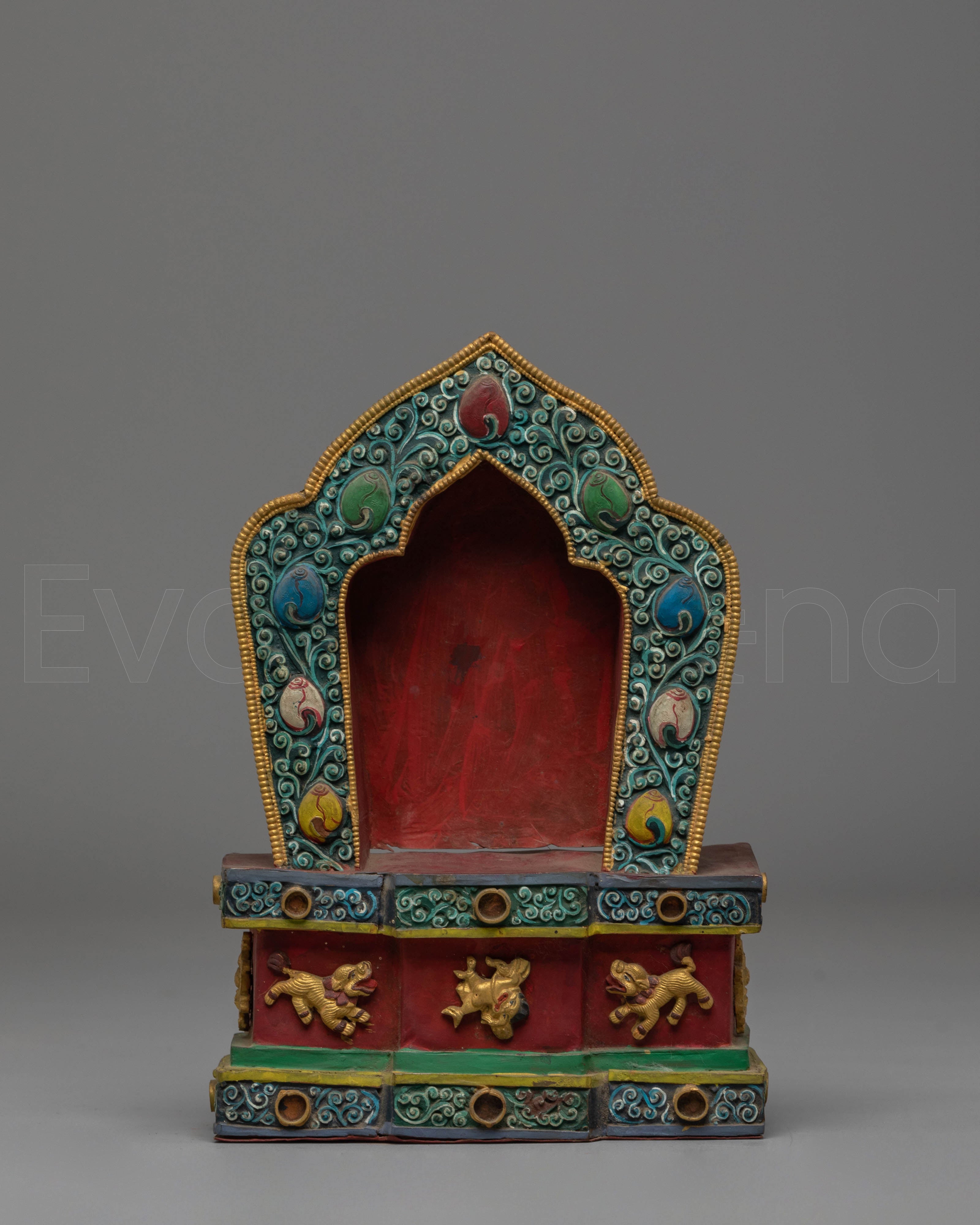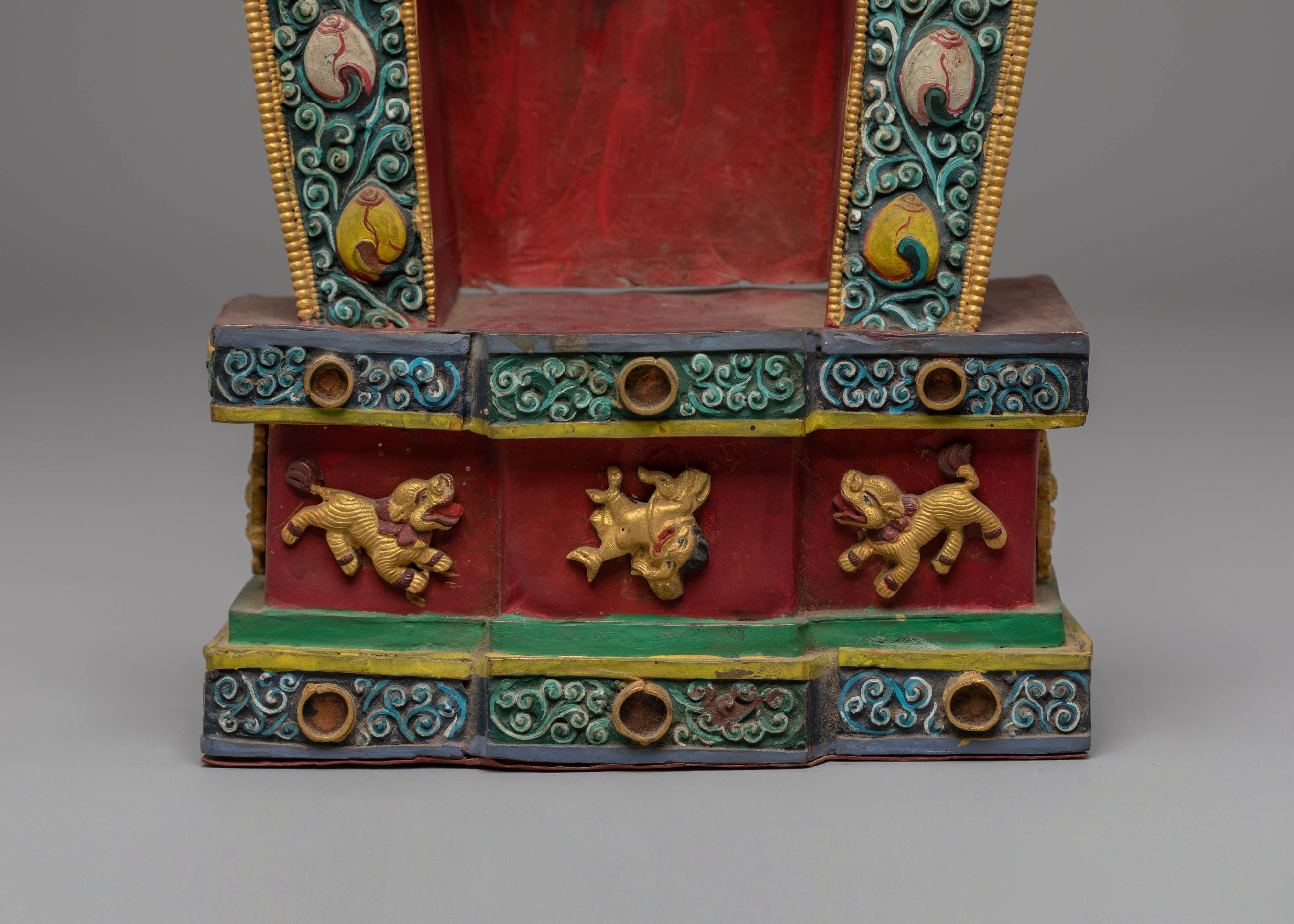 The central throne area—where the deity is placed—is painted a rich red and surrounded by intricately carved conches, symbolizing the spread of the Dharma in all directions. At the base of the throne, the torana features carvings of Buddhist animals, including snow lions flanking Garuda, representing courage, protection, and the triumph of awakened energy. These traditional elements reflect the classical Himalayan style and create a harmonious frame for any deity placed upon it.
