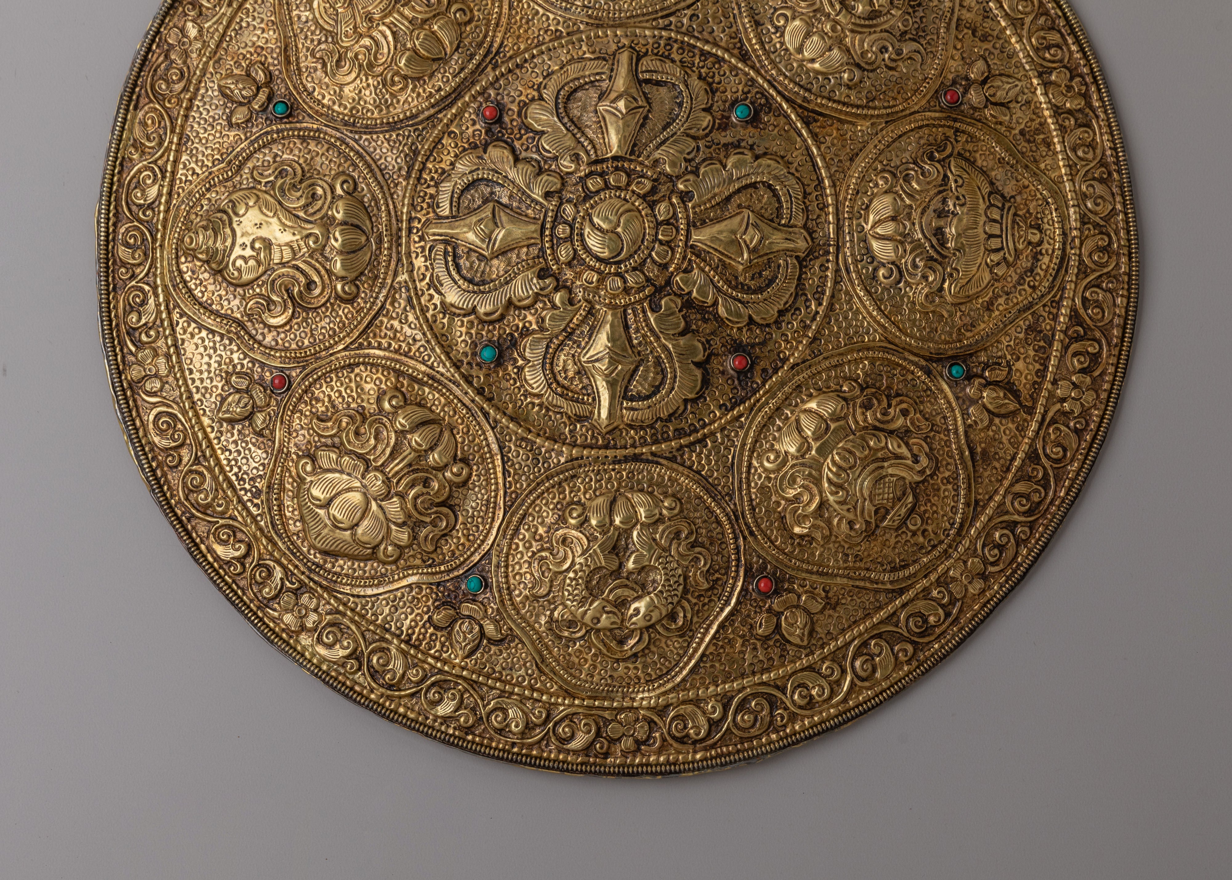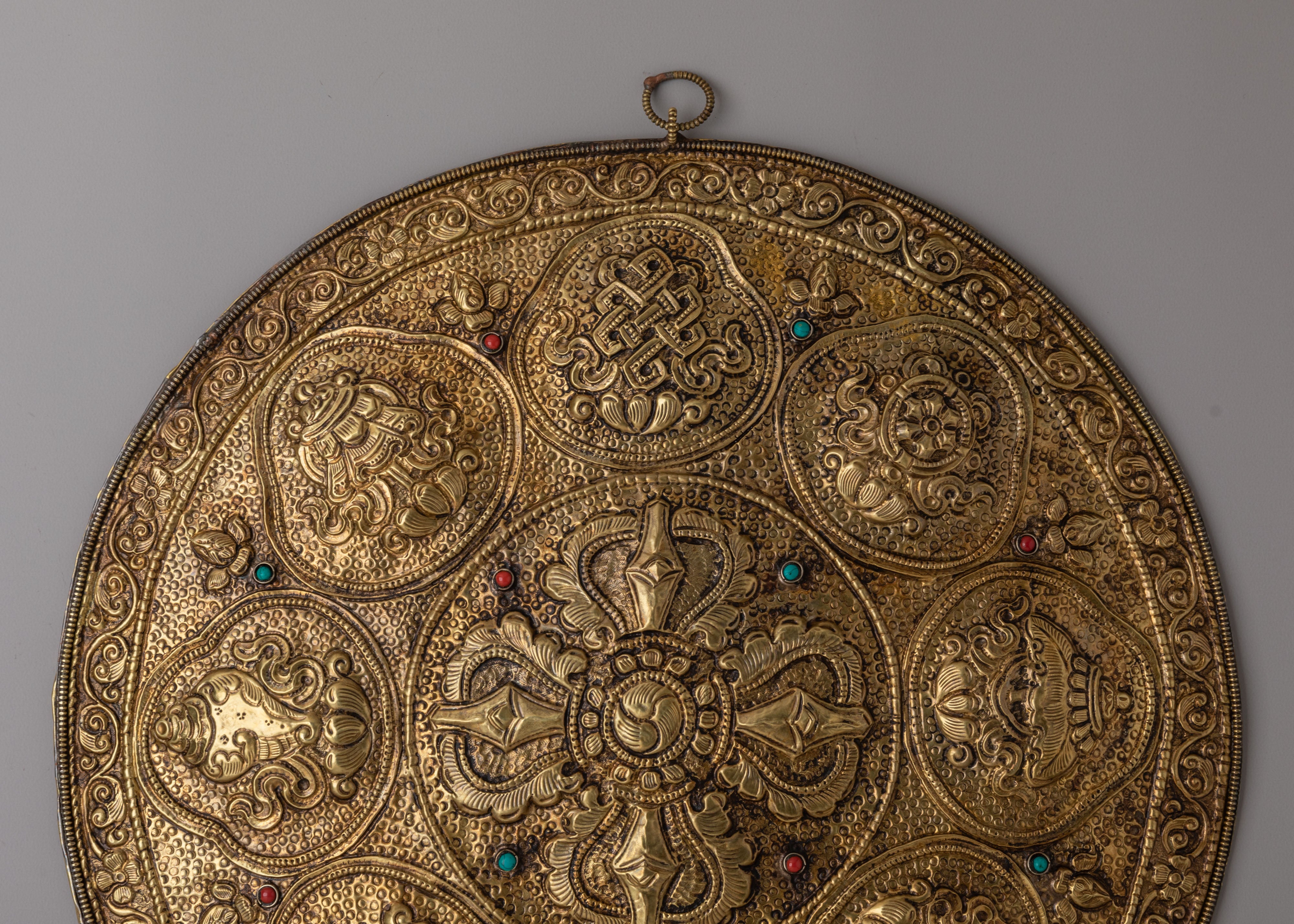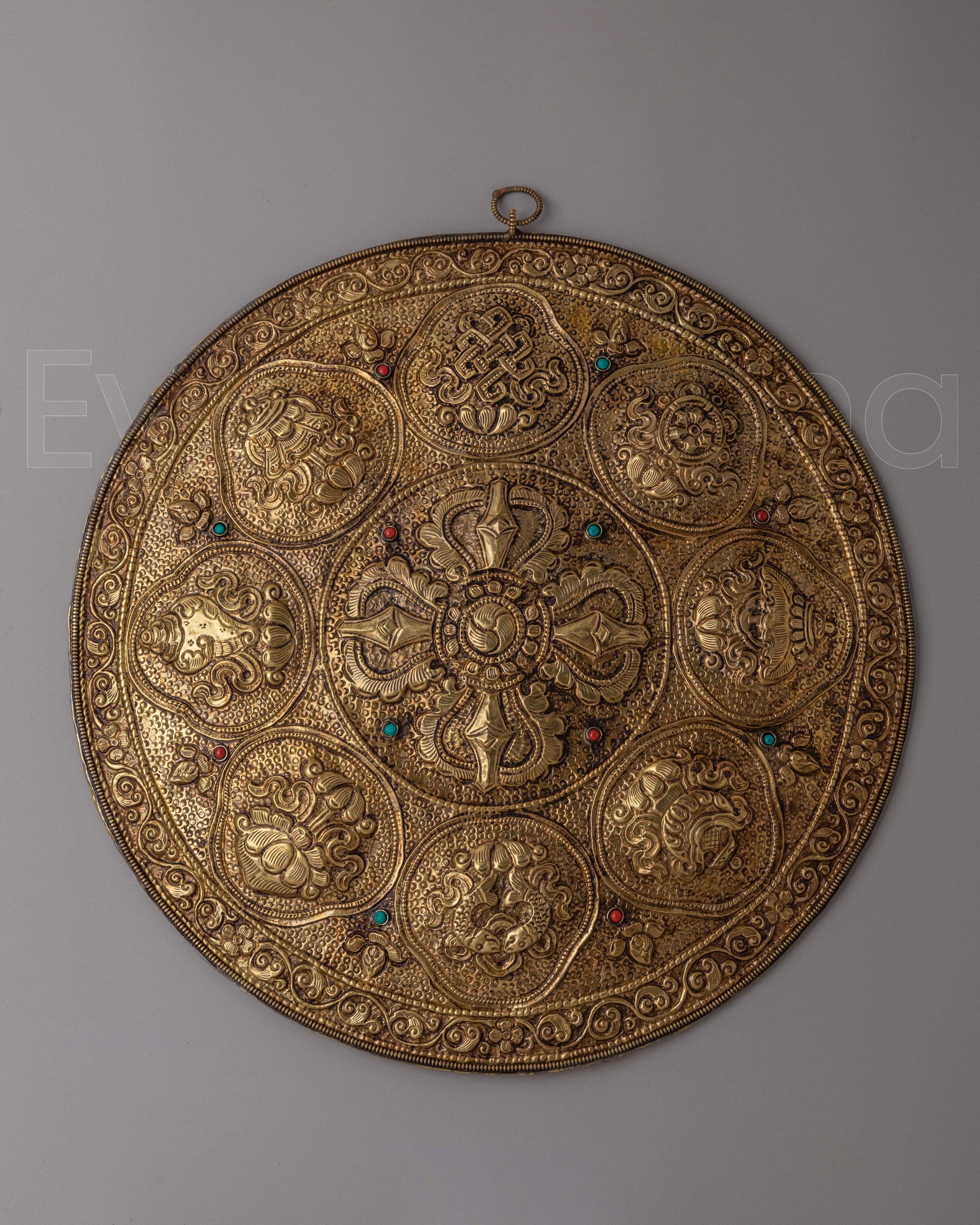 This Buddhist Symbol Wall Hanging Decor is a stunning handcrafted artwork designed to bring spiritual harmony and protection into your home. Made from copper and adorned with gemstones, this piece radiates positive energy and peace. Its intricate design features sacred Buddhist symbols, carefully crafted to enhance meditation practices and create a serene atmosphere in any space. Perfect for those seeking to connect with their spiritual journey, this wall hanging is not just a decorative item but a powerful tool for mindfulness and inner balance.