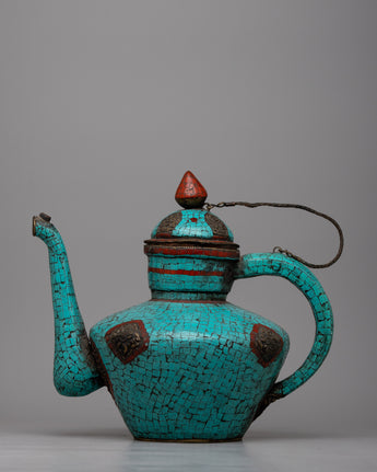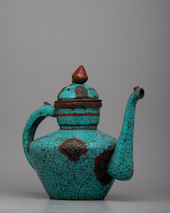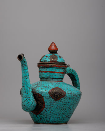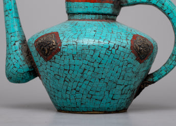 Presenting the Buddhist Tea Pot Kettle—a fascinating fusion of design and use. Its design, which is handcrafted on a copper body and features strategically placed flat-cut turquoise and coral stones, exudes a captivating charm. Although it's a beautiful accent to any interior design concept, its main function is decorations.