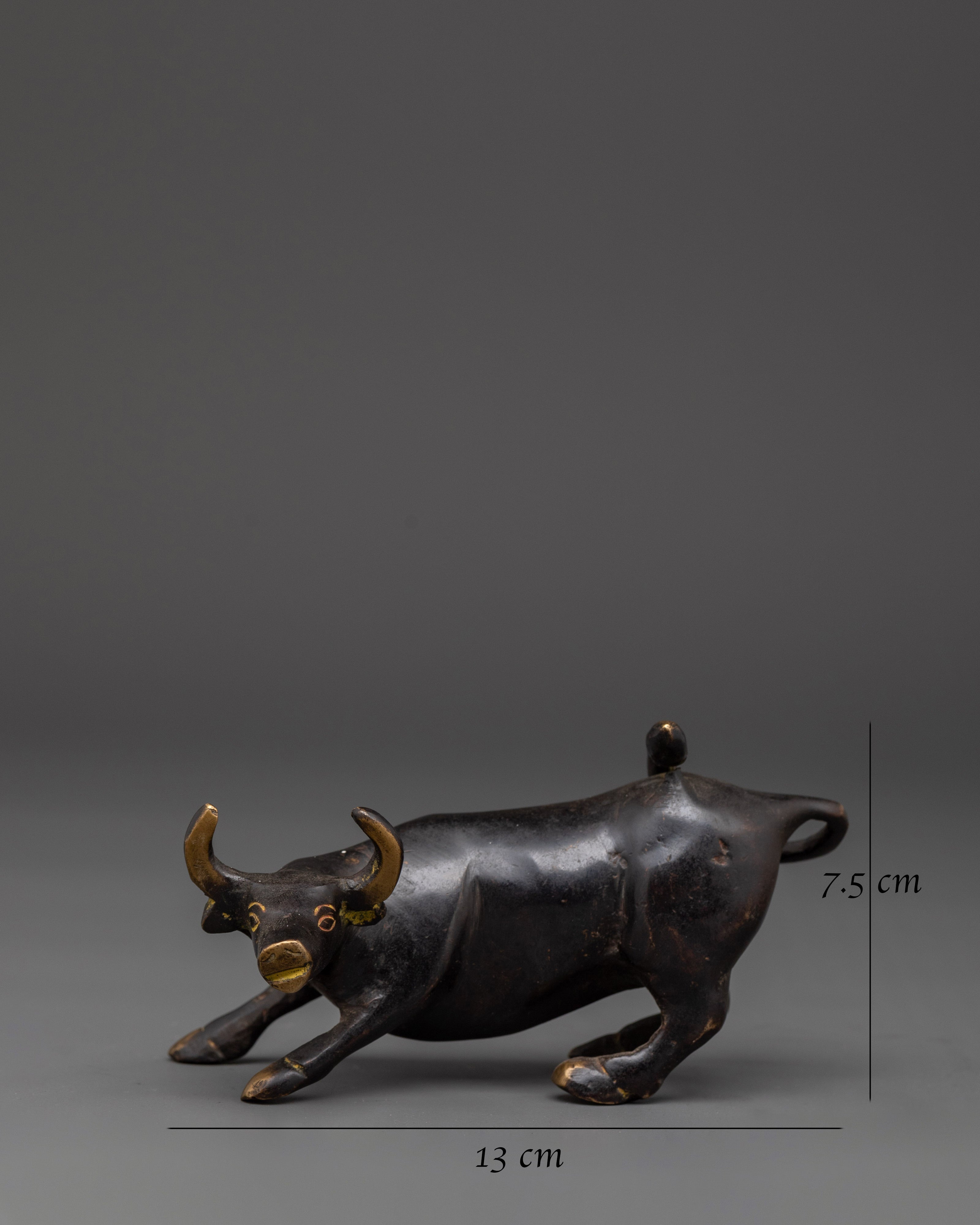 This Bull Sculpture for Decor symbolizes power, resilience, and prosperity, highly valued in both spiritual and artistic traditions. This brass bull statue, measuring 7.5cm in height, 13cm in width, and weighing 0.57kg, is a magnificent example of traditional metal craftsmanship. The masterfully carved statue captures the bull's muscular form and dynamic stance, symbolizing courage, confidence, and unshakable vitality. Its antique finish adds depth to the design and exudes timeless sophistication in any home or business setting.