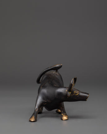 In many cultures, the bull is seen as a symbol of abundance and protection, hard work, and the ability to overcome life's difficulties. This handcrafted brass item embodies these themes through beautiful detailing, from its construction to the elaborate carvings that showcase the artisan's skill and dedication. The antique finish's warm golden-brown patina adds rustic beauty, transforming it into both a spiritual icon and a polished ornamental piece.