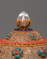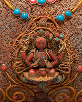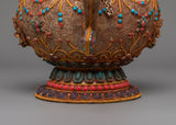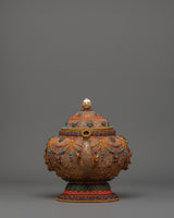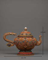 This Chenrezig carved Tea Pot is a magnificent example of sacred Tibetan creativity, capturing the sense of compassion and spiritual purity. This teapot, 26cm tall, 39cm wide, and weighing 2.50kg, exemplifies painstaking craftsmanship rooted in centuries of Himalayan tradition. With a copper body, silver plating, gold accents, and a semi-antique finish, it exudes everlasting spiritual beauty. The body is elaborately embellished with coral and turquoise stones, which symbolize vitality and healing, enhancing its visual beauty and spiritual resonance.