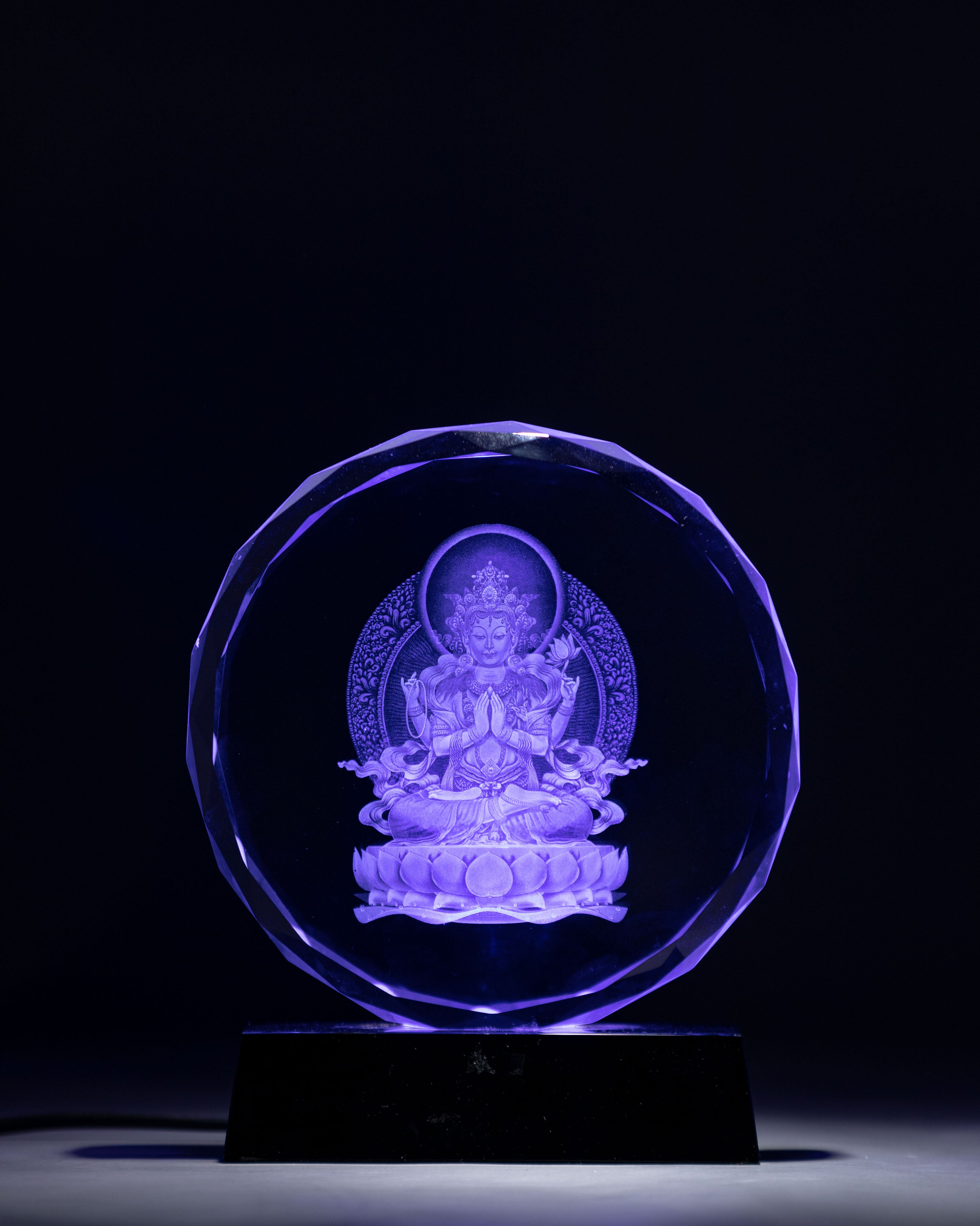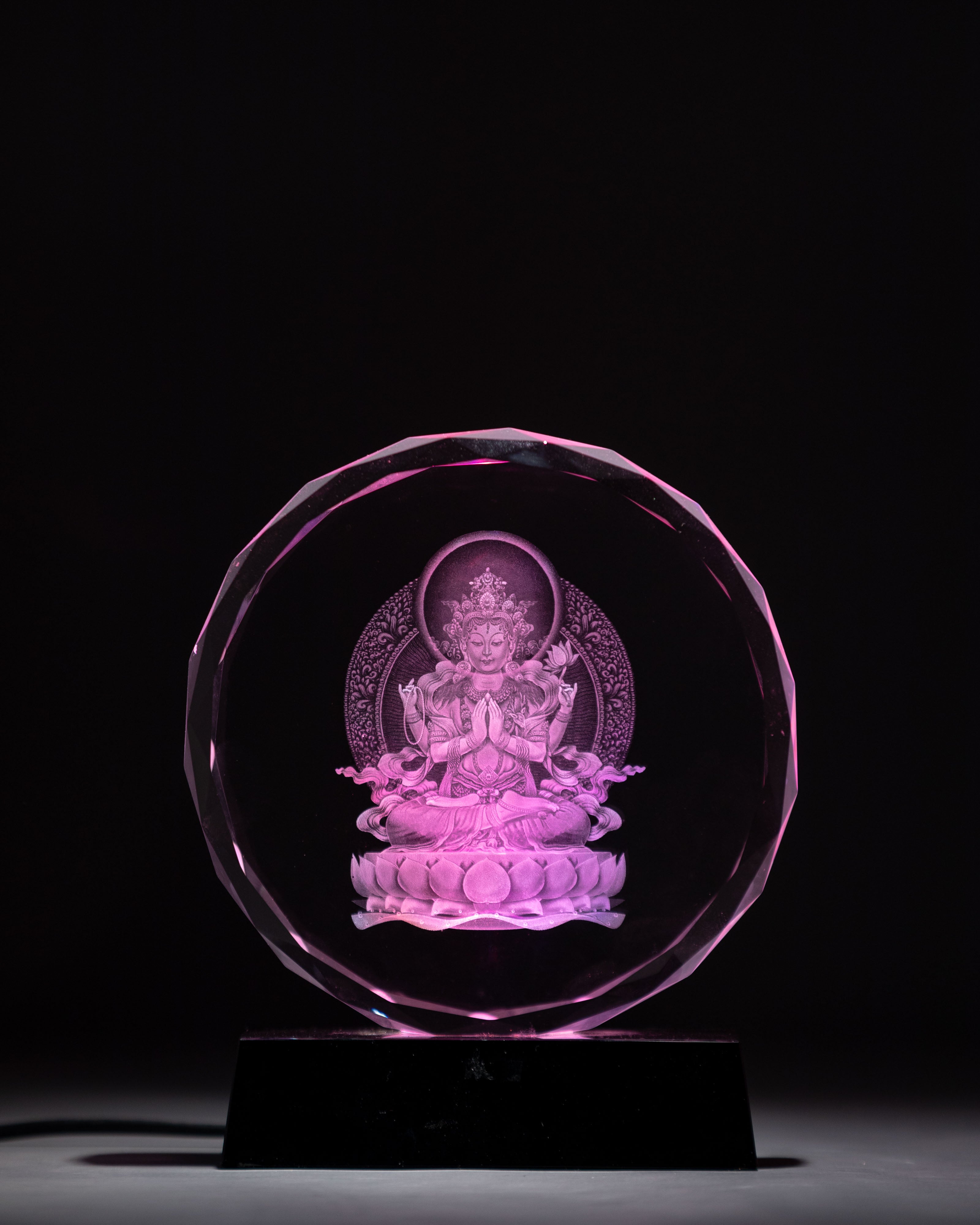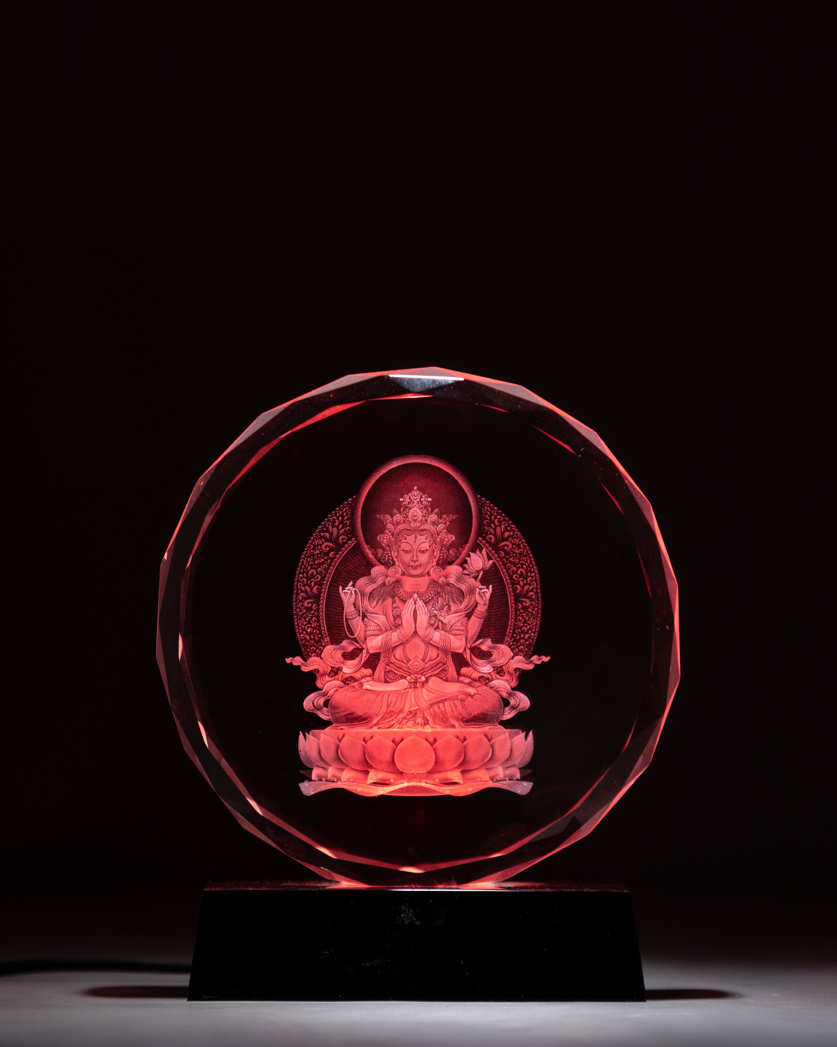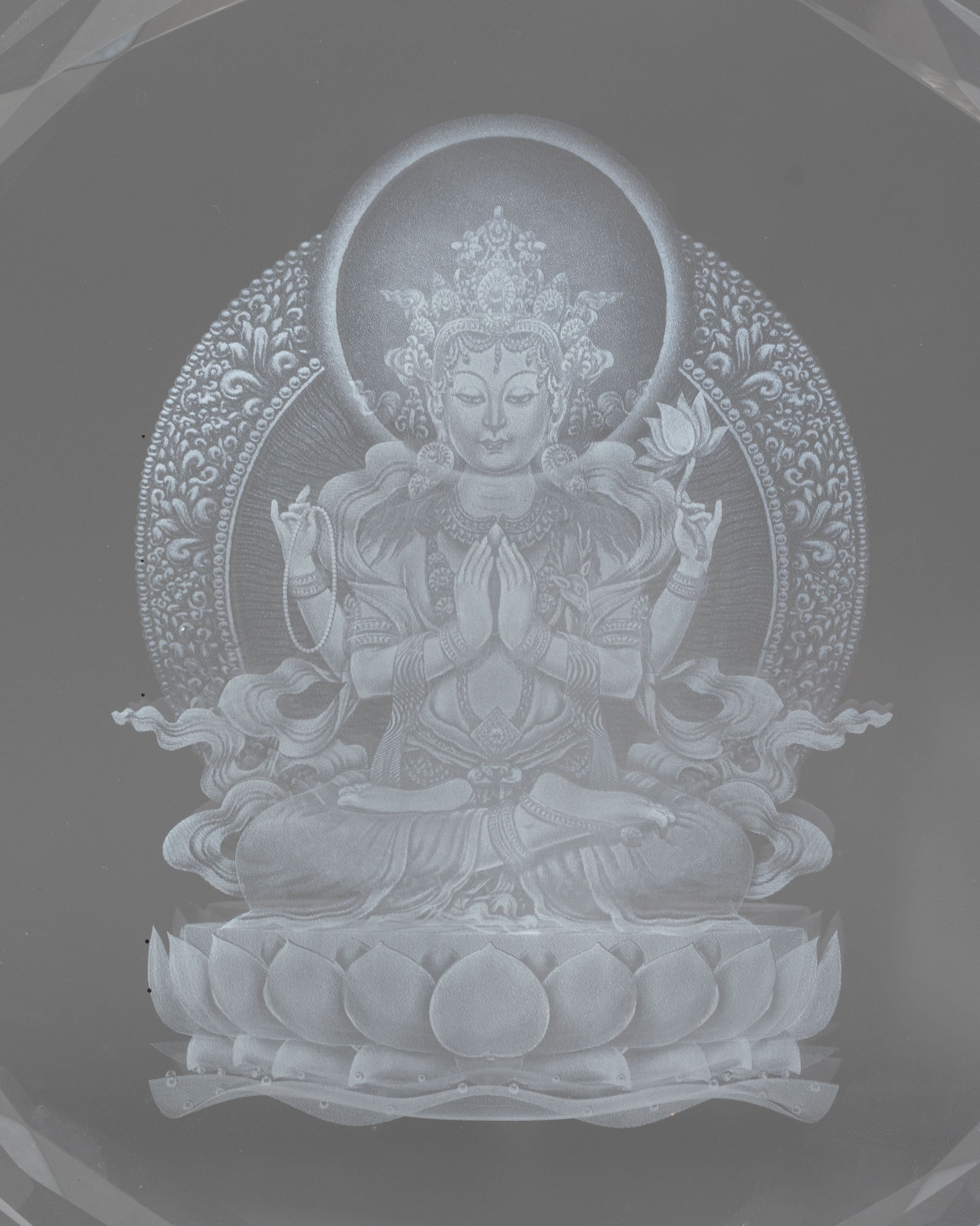 Handcrafted Chenrezig Glass Art with Wooden Base